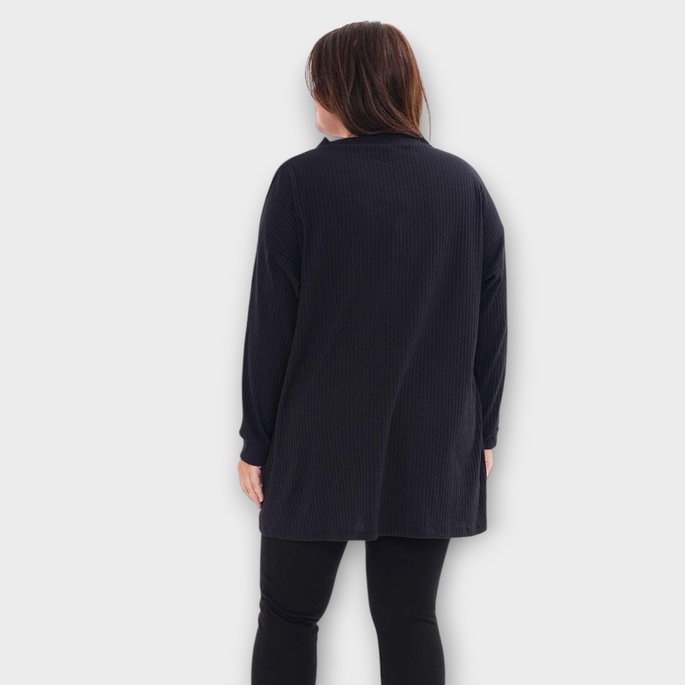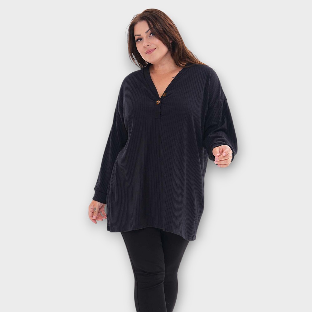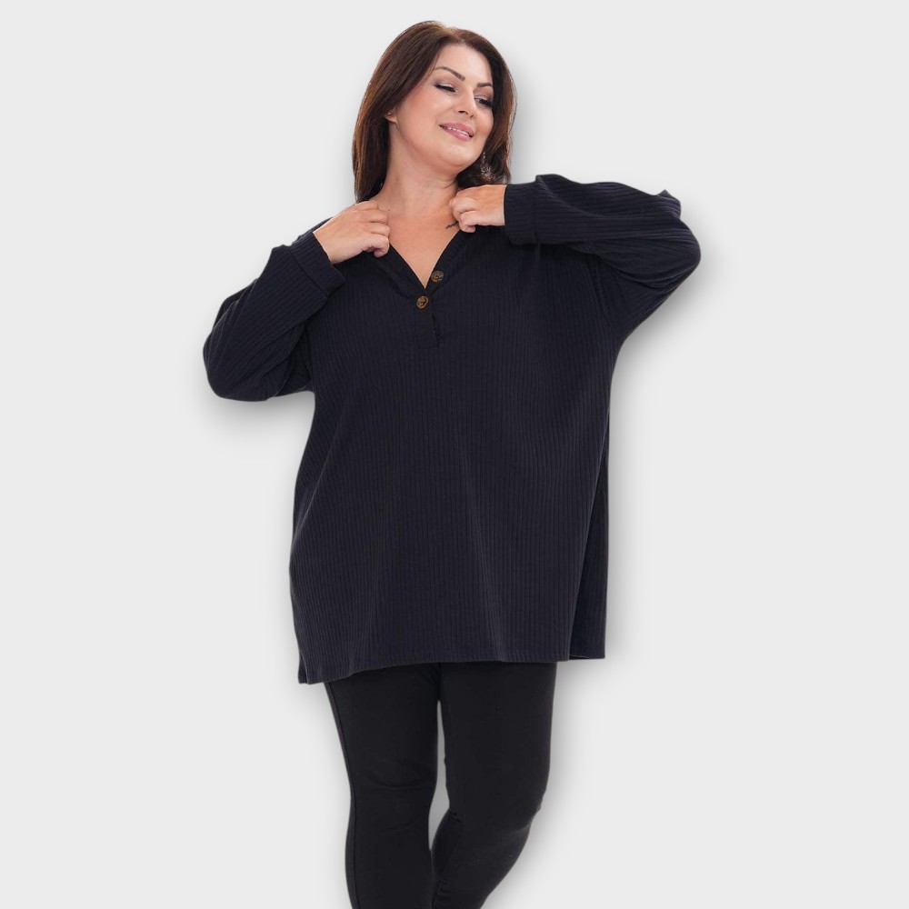 Väga mõnus ja pehme naiseliku V-kaelusega pikkade varrukatega triibulise koemustriga must pluus. Tegumood on alt veidi laienev, kaeluse ääres kaunistuks 2 nööpi.