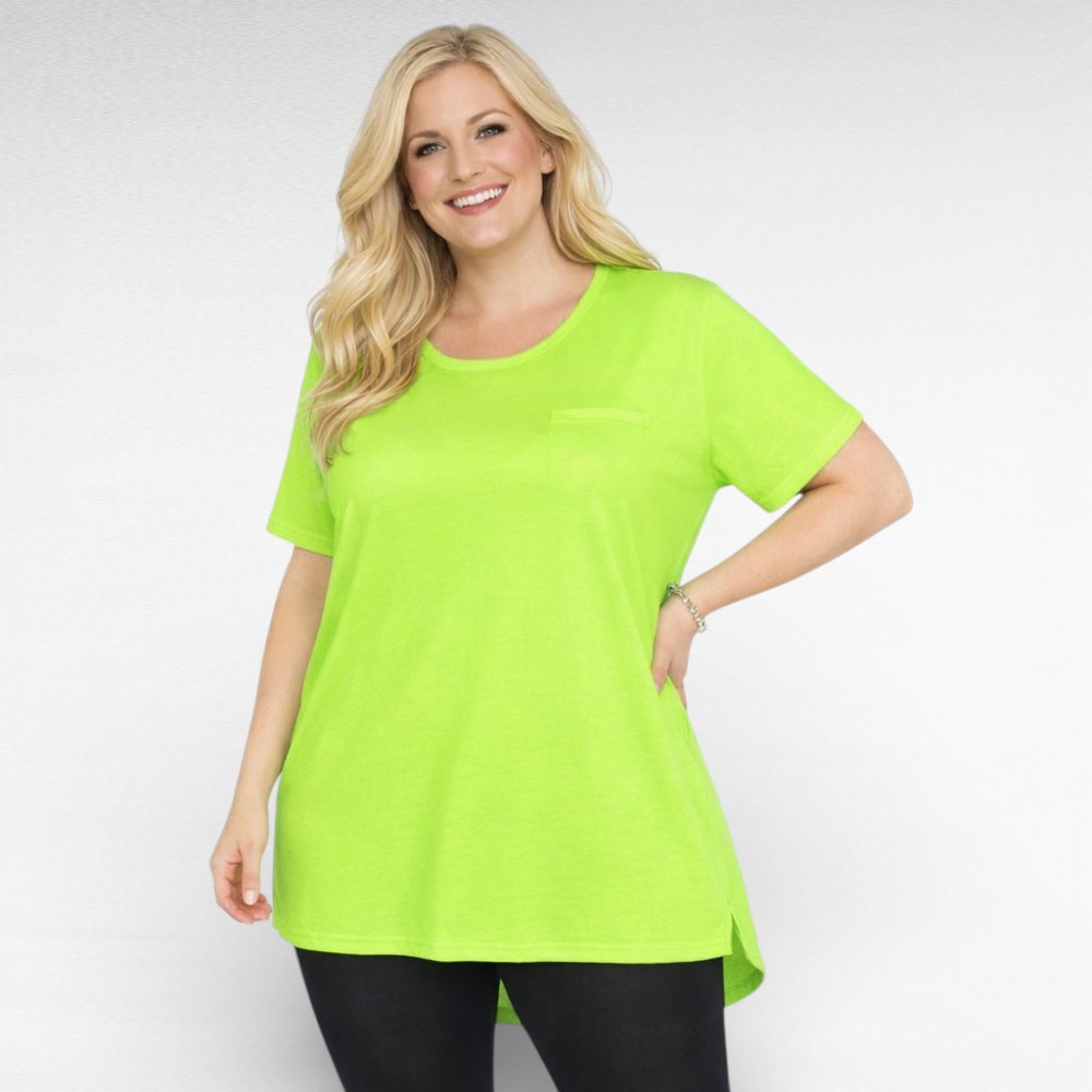 Armas igapäevane pikem neoonroheline rinna pealt tasku imitatsiooniga lühikeste varrukatega alt kaarjas ja külje pealt lõhikutega naiste T-särk Inglismaa firmalt “Yours Curve”. Tagant on umbes 5cm pikem kui eest, pikkusemõõt on antud tagant.