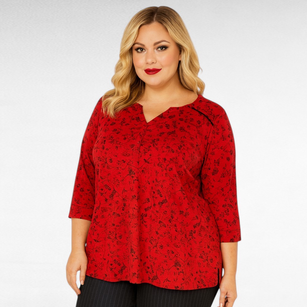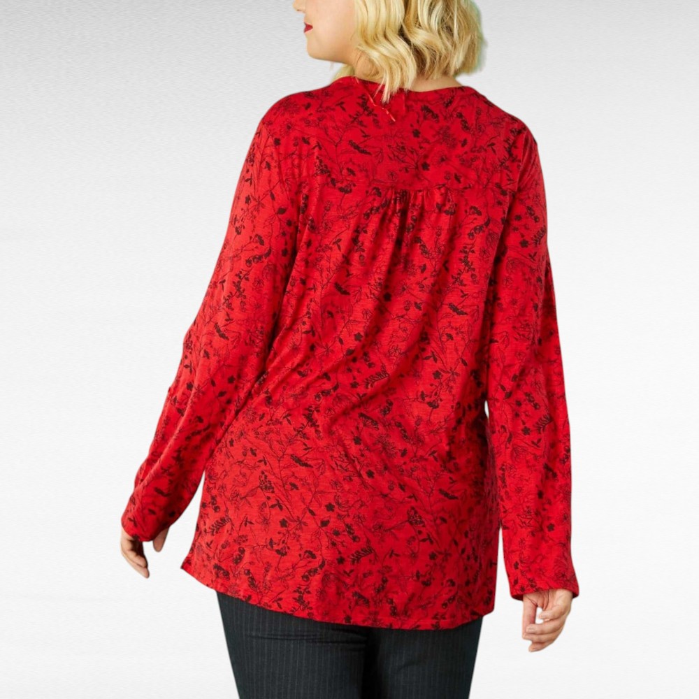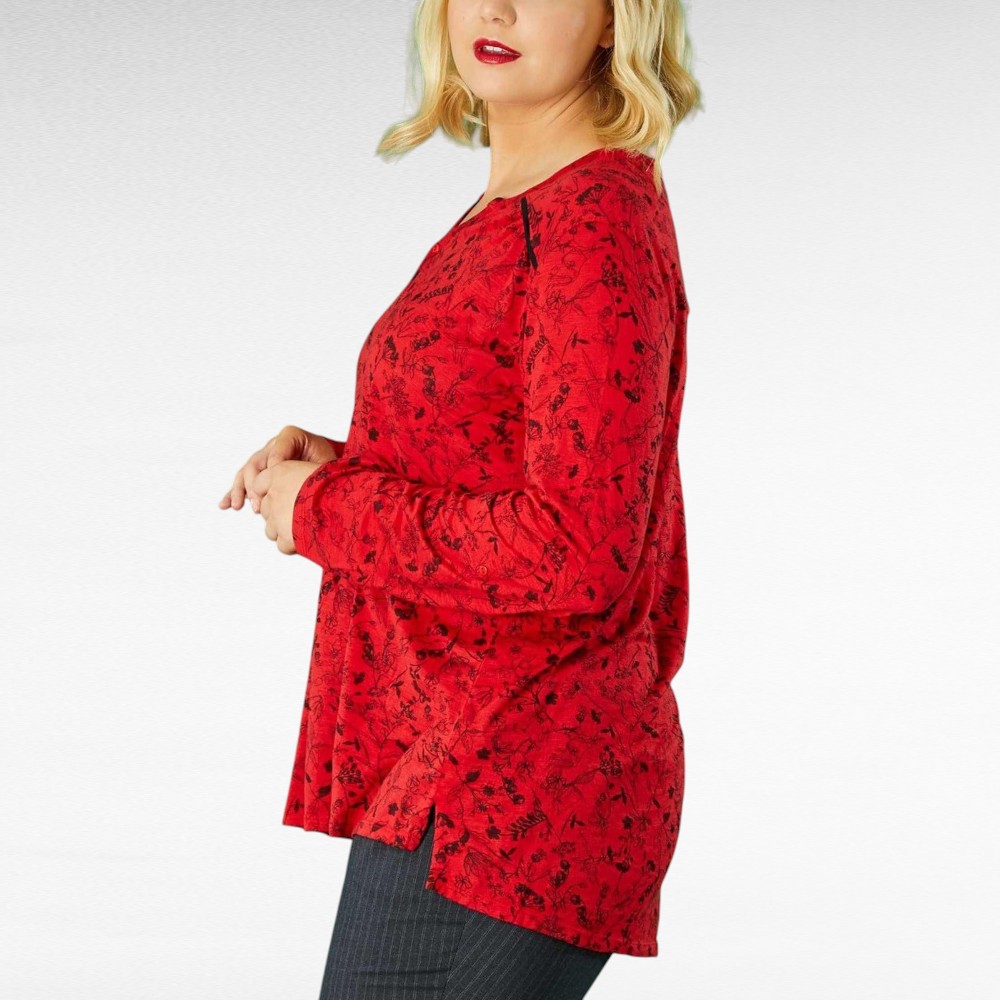 Mõnusast pehmest venivast materjalist pikkade ülespandvate varrukatega V-kaelusega alt veidi laieneva lõikega punast värvi mustakirju lillemustriga igapäevased pluusid Inglismaalt firmalt “Kiabi”. Varrukad saab nööbiga üles kinnitada ja umbes 20cm lühemaks teha.