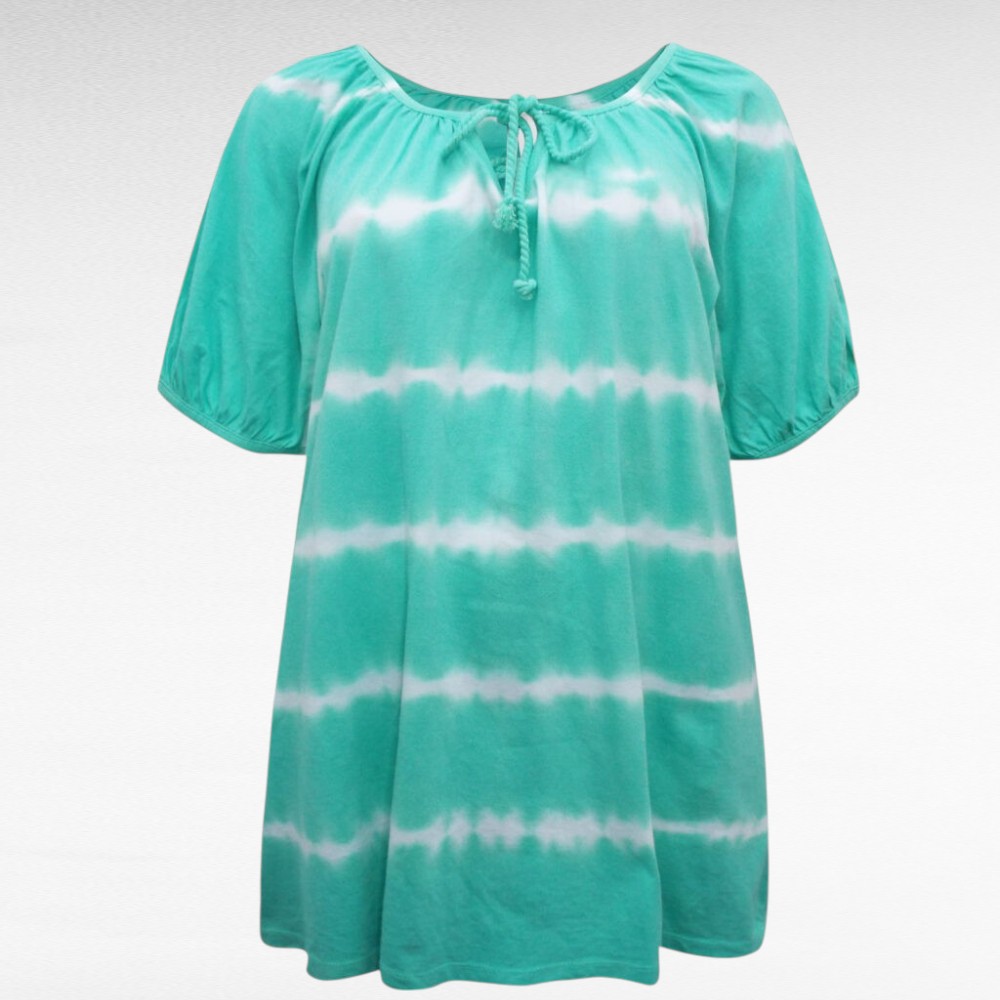 Väga heast pehmest venivast puuvillasest nahasõbralikust materalist ilusat mündirohelist tooni hajutatud valgetriibulise mustriga kaeluse äärest paeltega raglaanlõikega pluus Inglismaalt firmalt “Sheego”. Lõige on alt veidi laienev.