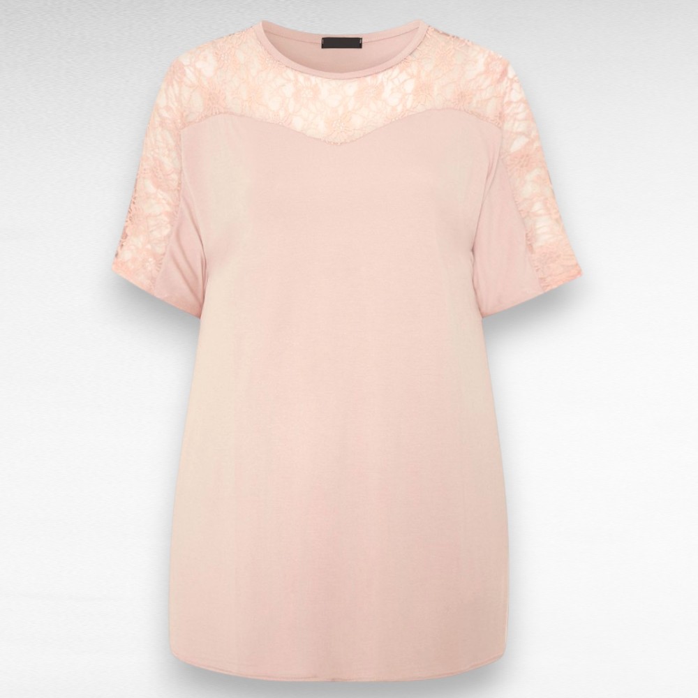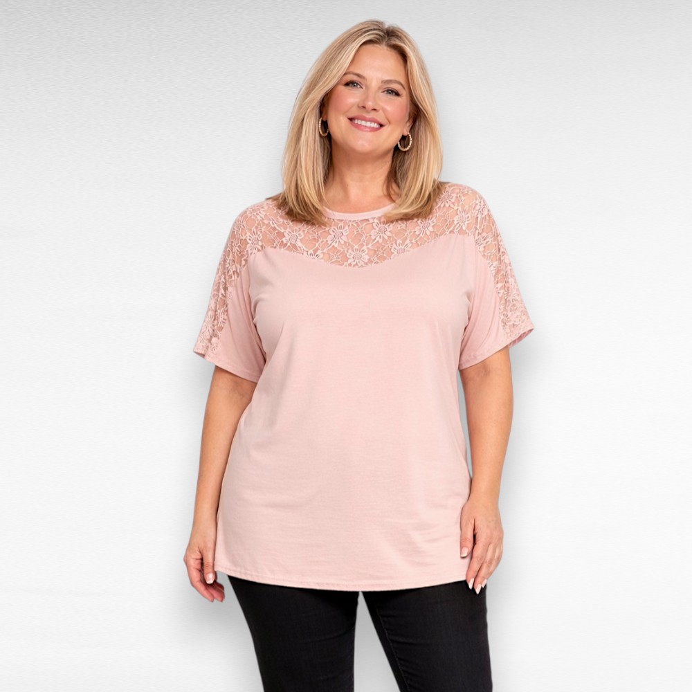 Puudriroosa rinnaosast kauni pitsiga, pikendatud õlaosaga, lühikeste varrukatega pikem stretchikas pluss suuruses naiste pluus Inglismaalt firmalt “Yours”. Pits tuleb ka üle varruka, väga naiselik ja kena. Pehme, veniv materjal.
