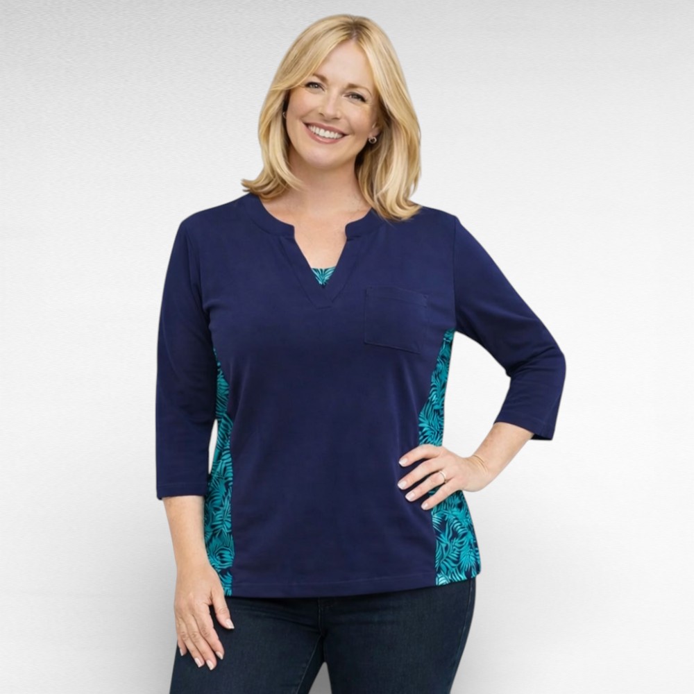 Mõnusast pehmest venivast puuvillasest materjalist tumesinine V-kaelusega pluus Inglismaalt firmalt “Natural Reflections”. Selja taga ilus roheline džunglimuster, käised on poolpikad, rinnal tasku.