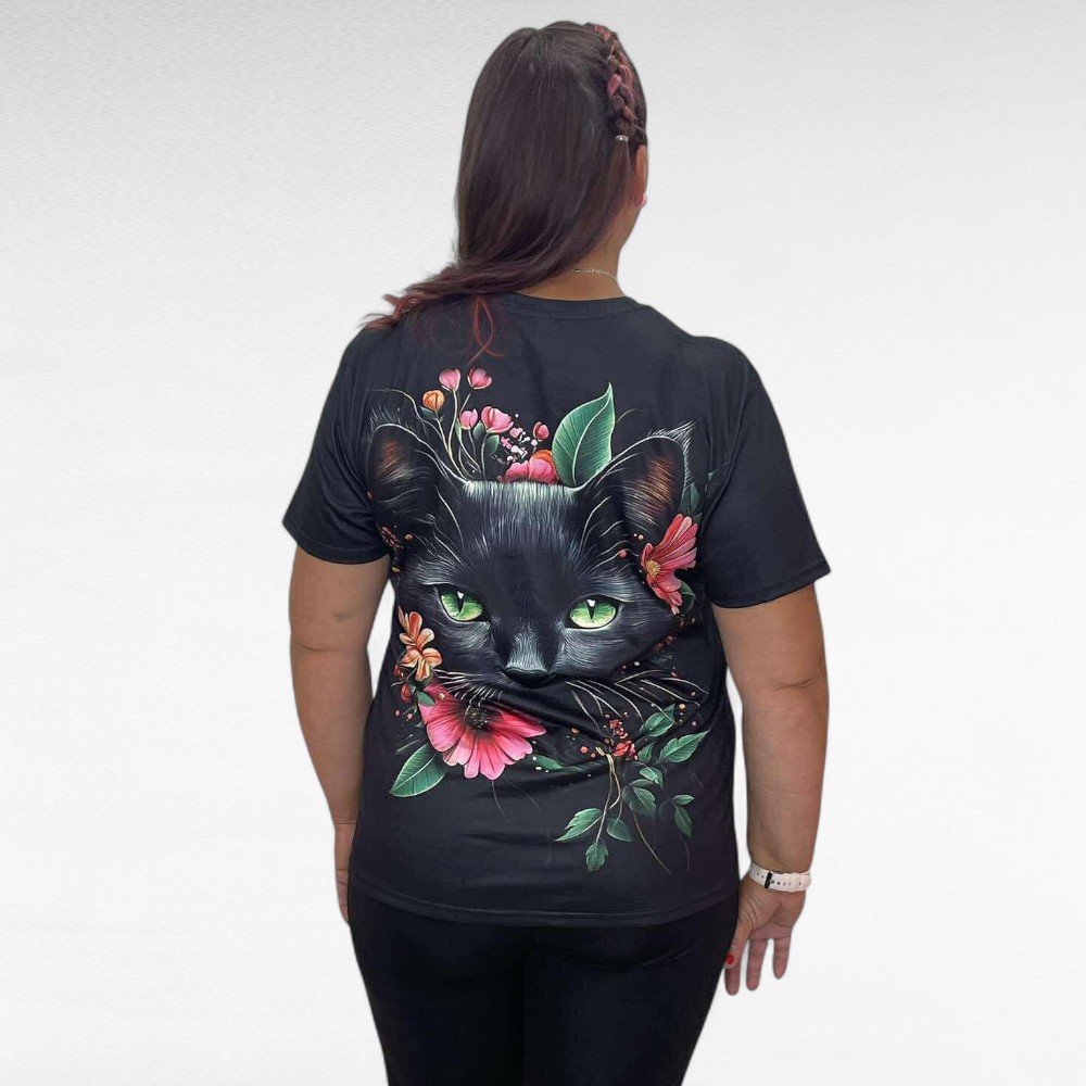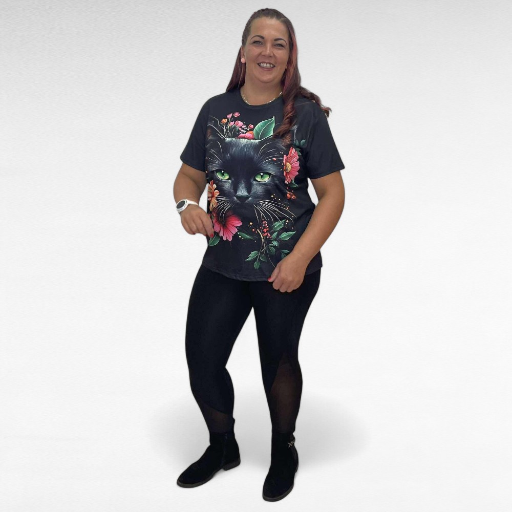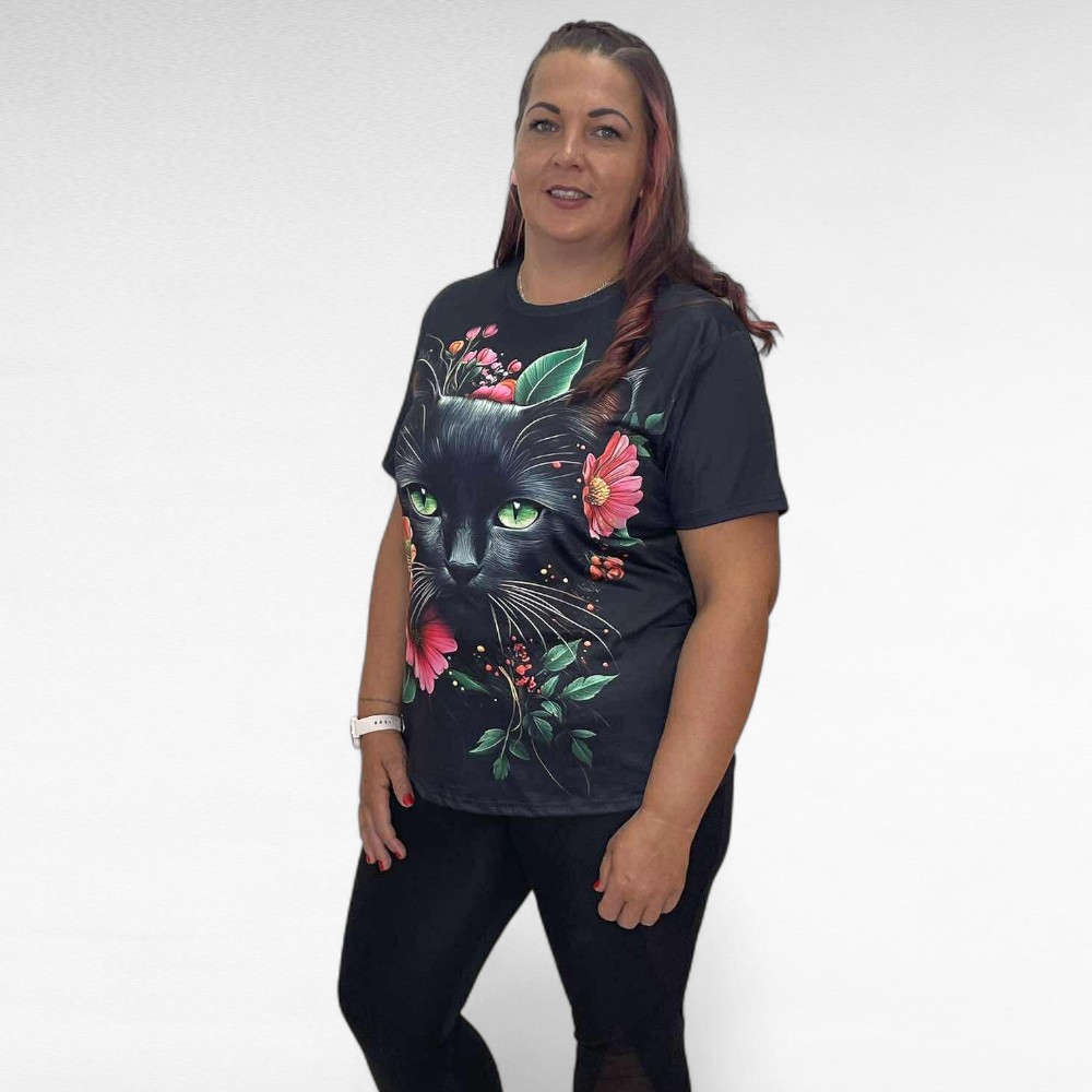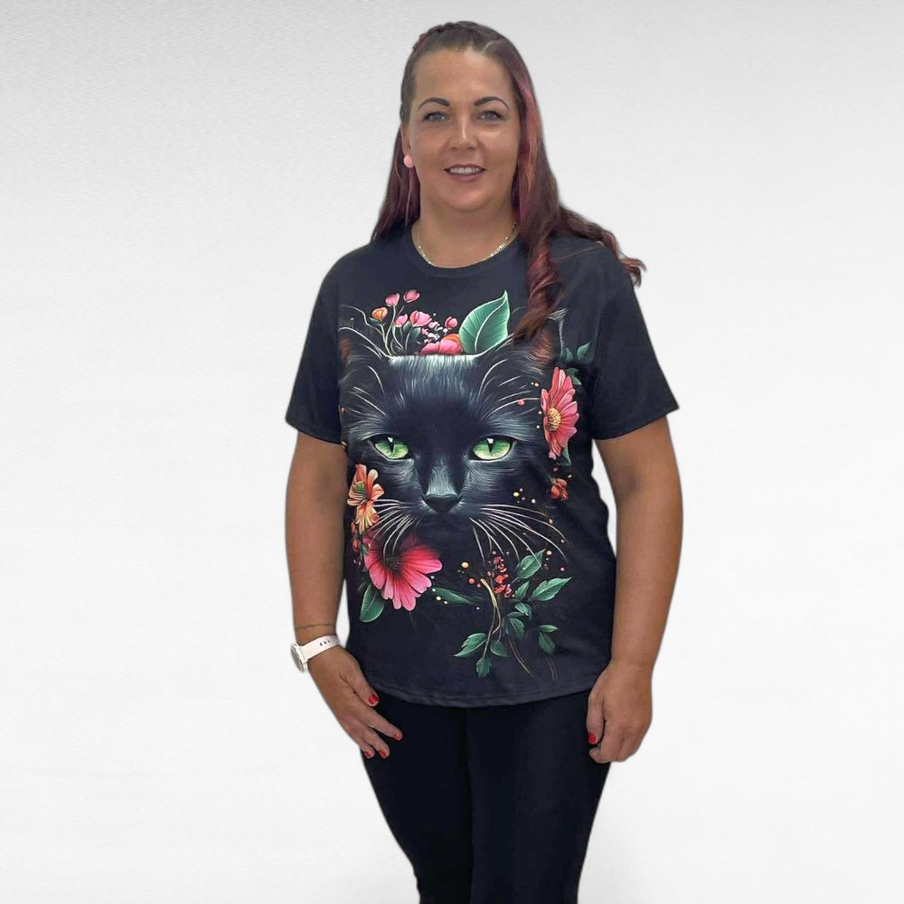 Pilkupüüdev must suure kassipildi ja värviliste lilledega lühikeste varrukatega pluus. Pehme veidi veniv materjal, ei kortsu.