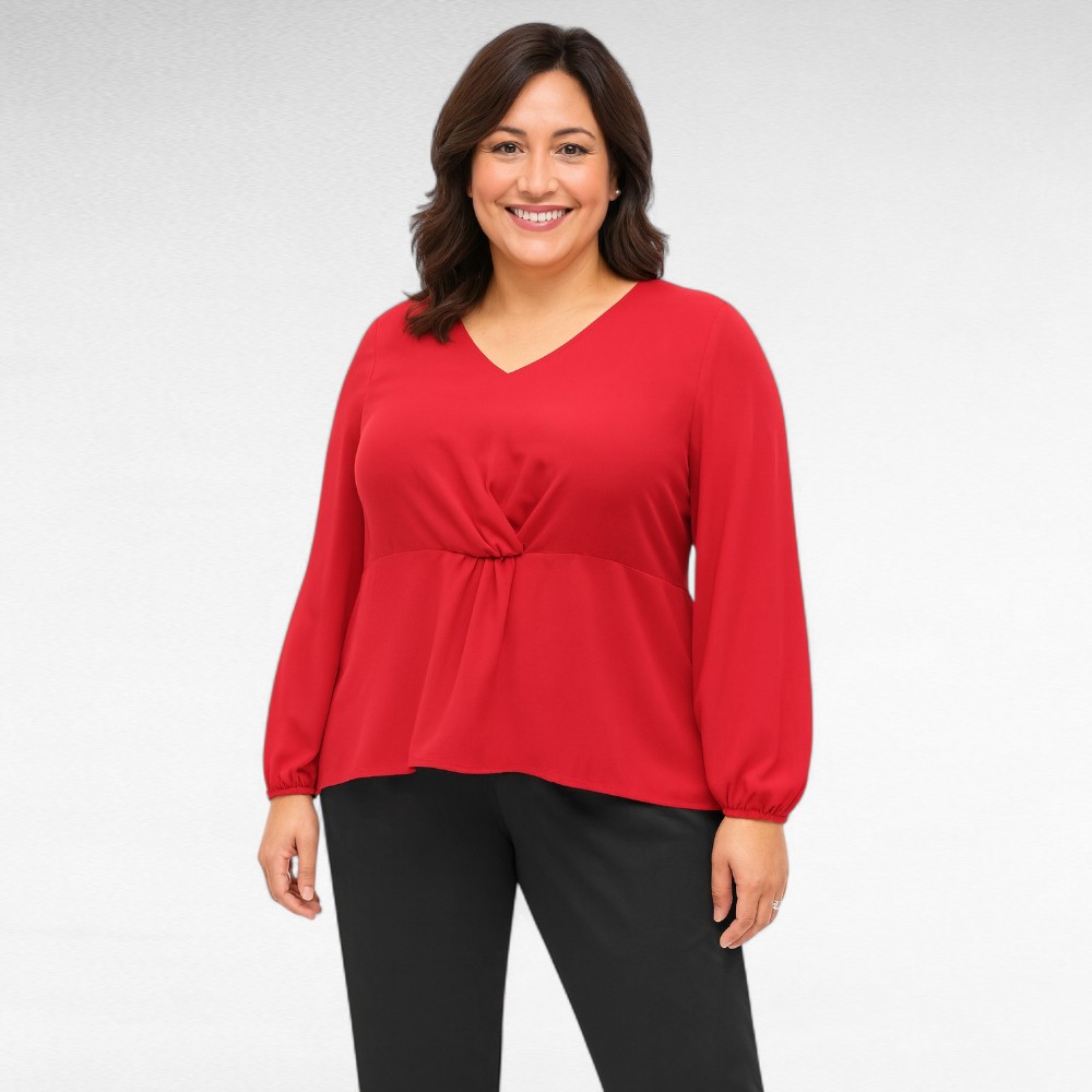 Pidulik siidjast materjalist punane V-kaelusega pikkade varrukatega pluus firmalt “Ellos”. Vöökohas on sõlm, varrukad on otsast kummiga. Lõige on alt veidi laienev.