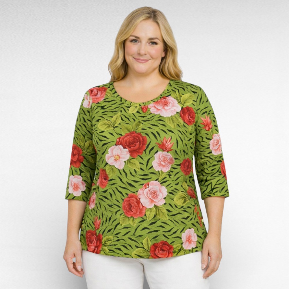 Roheline suure roosakaspunase lillemustriga pluus firmalt “Sabex”. Mugavad 3/4 pikkusega varrukad. Väga mõnus pehme ja veniv nahasõbralik materjal.