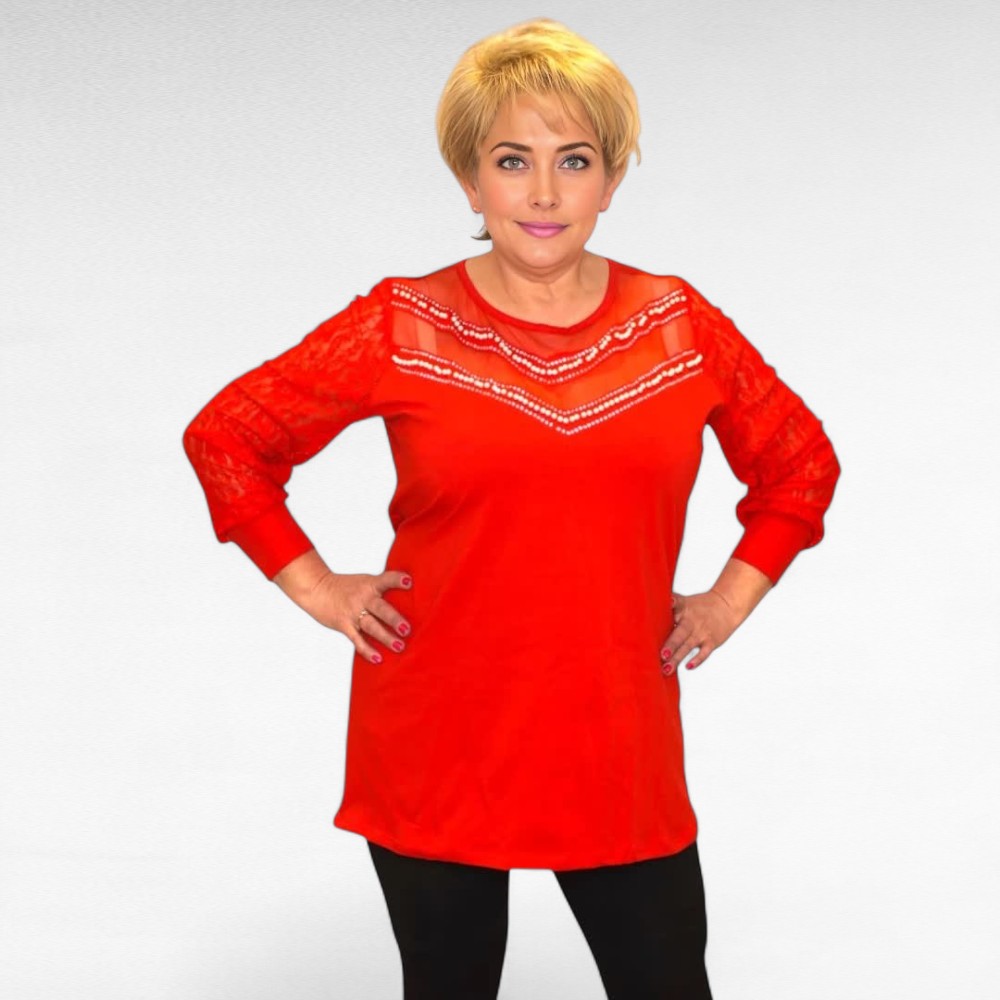 Pidulik venivast stretchikast materjalist rinnaosast imekauni pitsi ja pärlitega ehitud pikkade pitsvarrukatega punane pluus firmalt “Womanary”. Varruka otstes laiad kandid.