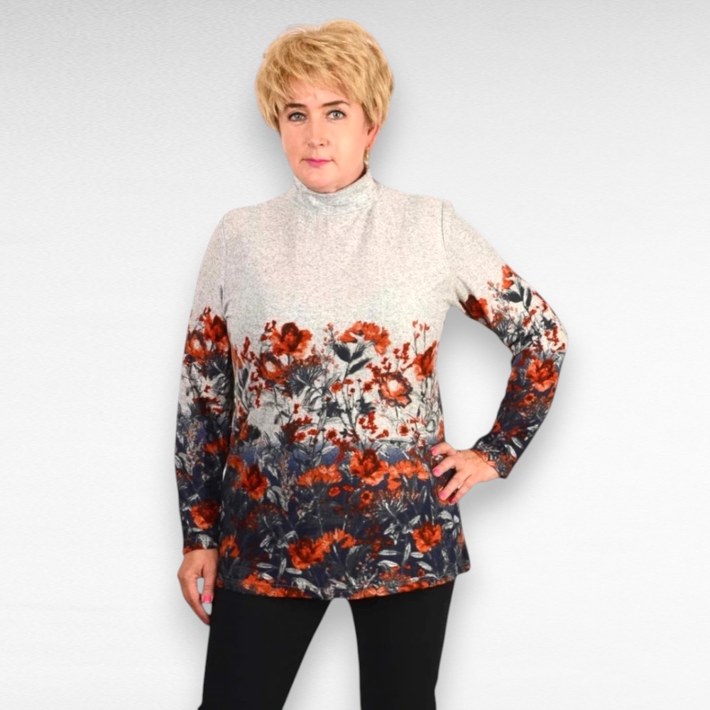 Hästi mõnus pehme kõrge kaelusega pikkade varrukatega ülevalt helehall ja alt ning varrukatelt oranži lillemustriga kaunistatud pluus “Lintebob”.