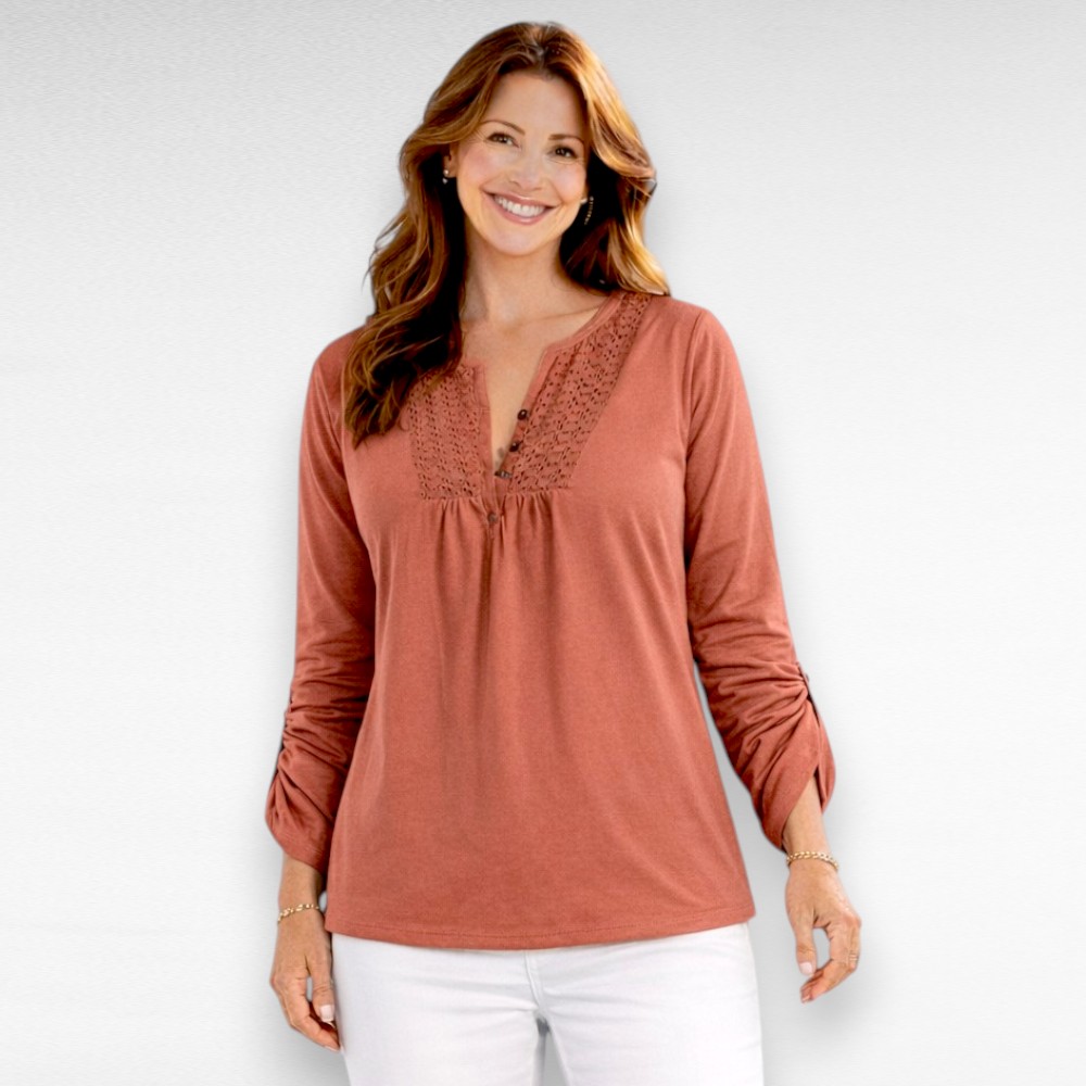 Naiselik broderiipitsiga kaunistatud pikkade ülespandavate varrukatega pluus firmalt “Blancheporte”. V-kaelus, kinnitub 4 nööbiga. Rinnal imekaunis broderiipits. Kena pluus teksadega kandmiseks.