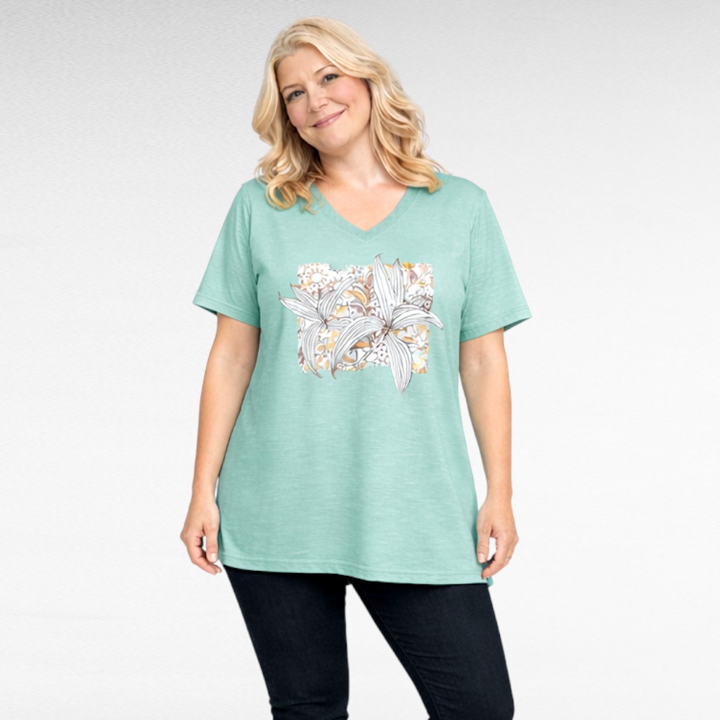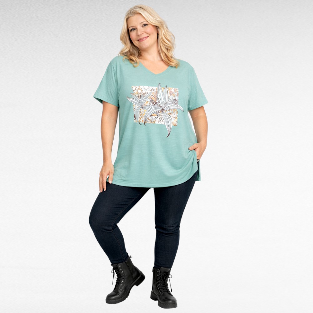 Pluss suurus kandjatele sobiv pluus on hea pikkusega, sirge lõikega ning langeb kehal vabalt ja kaunilt. V-kaelus toob esile dekoltee, all külgedel olevad lõhikud lisavad liikumismugavust. Seljaosa on umbes 6cm pikem kui esiosa, pakkudes meeldivat katvust ja enesekindlust.