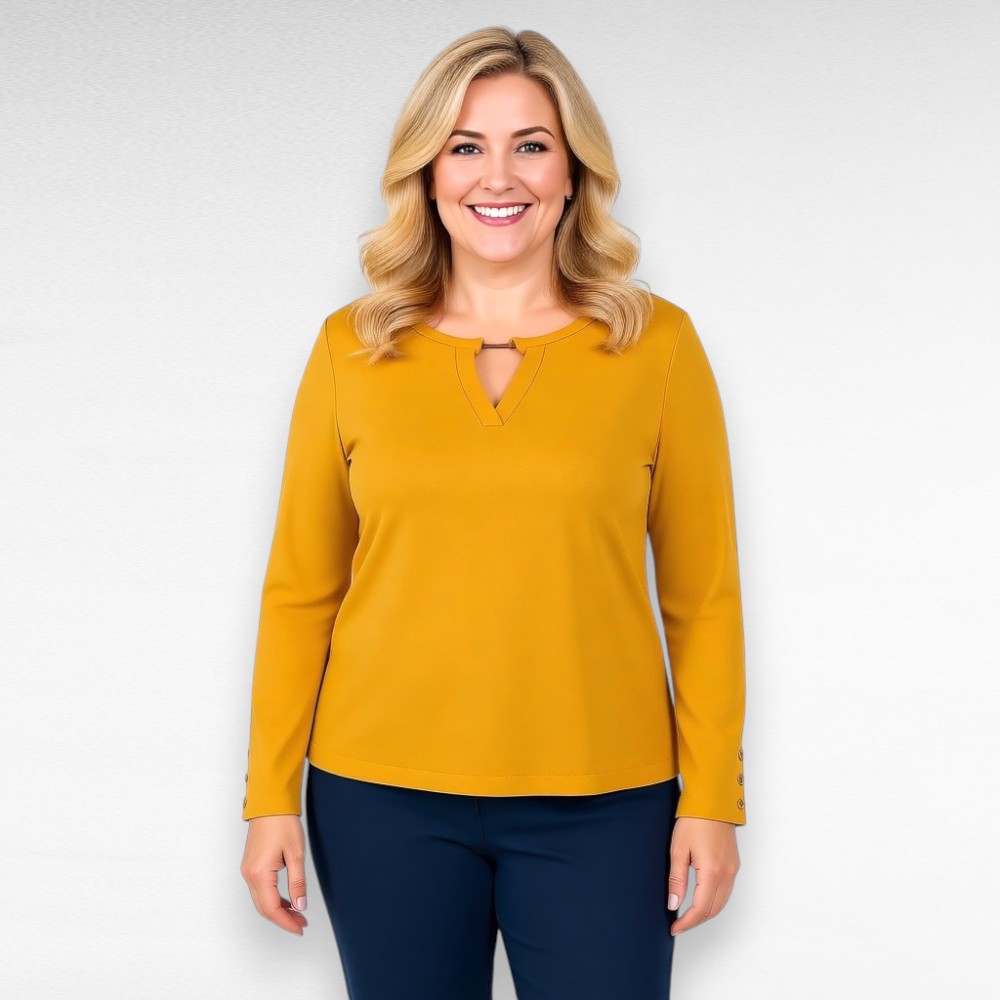 Pehmest nahasõbralikust veidi venivast materjalist igapäevane kena kaeluse äärest metallkaunistusega pluus Inglismaalt firmalt “Fair Lady”. Sobib nii pükste kui seelikuga kandmiseks. Varruka otstes kaunistuseks nööbid.