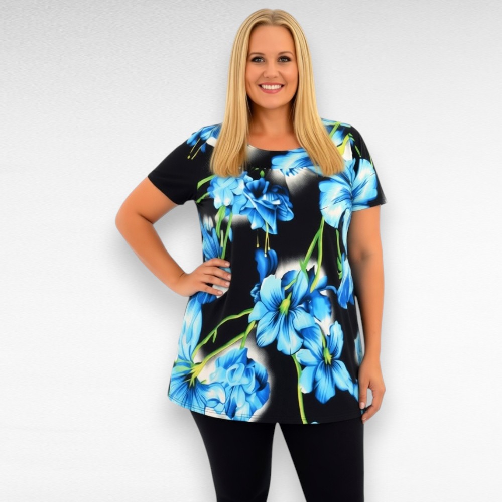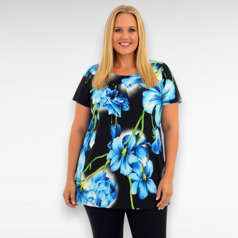 See pikem lühikeste varrukatega särava lillemustriga tuunika on loodud naisele, kes soovib tunda end ühtaegu mugavalt ja kaunilt. Alt laienev lõige langeb pehmelt ja loob tasakaalus silueti, rinnaosas ja turja pealt kergelt kroogitud passe lisab naiselikku vormi ning annab tuunikale õhulise liikuvuse.