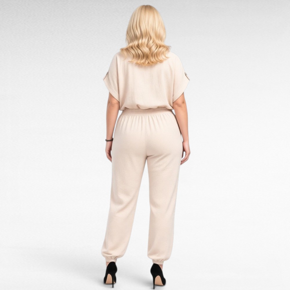 See pluss suuruses jumpsuit on loodud naisele, kes hindab nii elegantsi kui ka praktilisust. Kaunilt langev lõige toob esile figuuri parimad küljed, samal ajal pakkudes liikumisvabadust ja kandmismugavust kogu päevaks. Keskelt peenikeste kummidega läbilõige rõhutab taljet õrnalt ja naiselikult, luues kauni silueti.