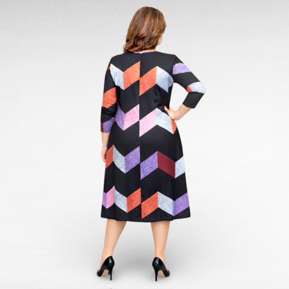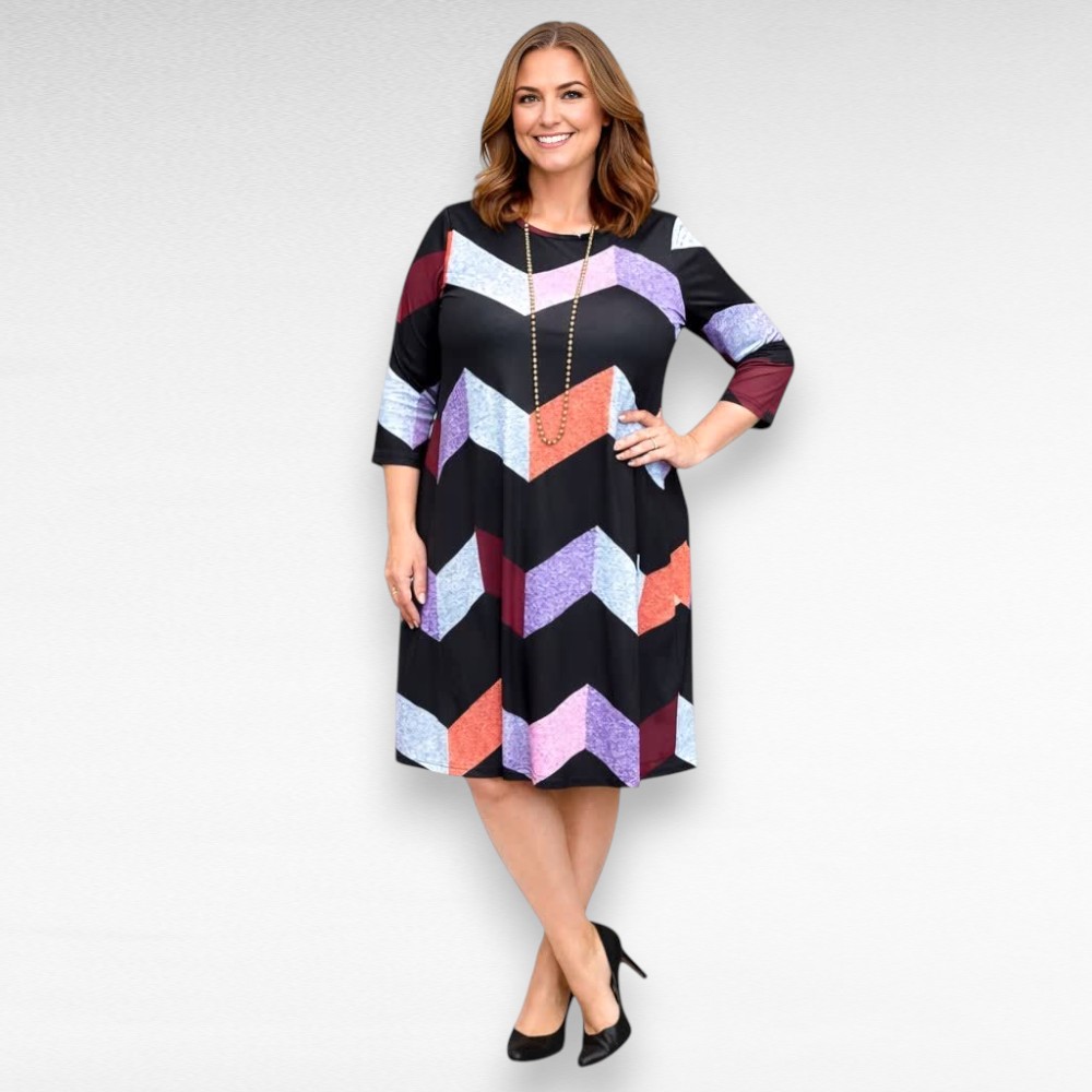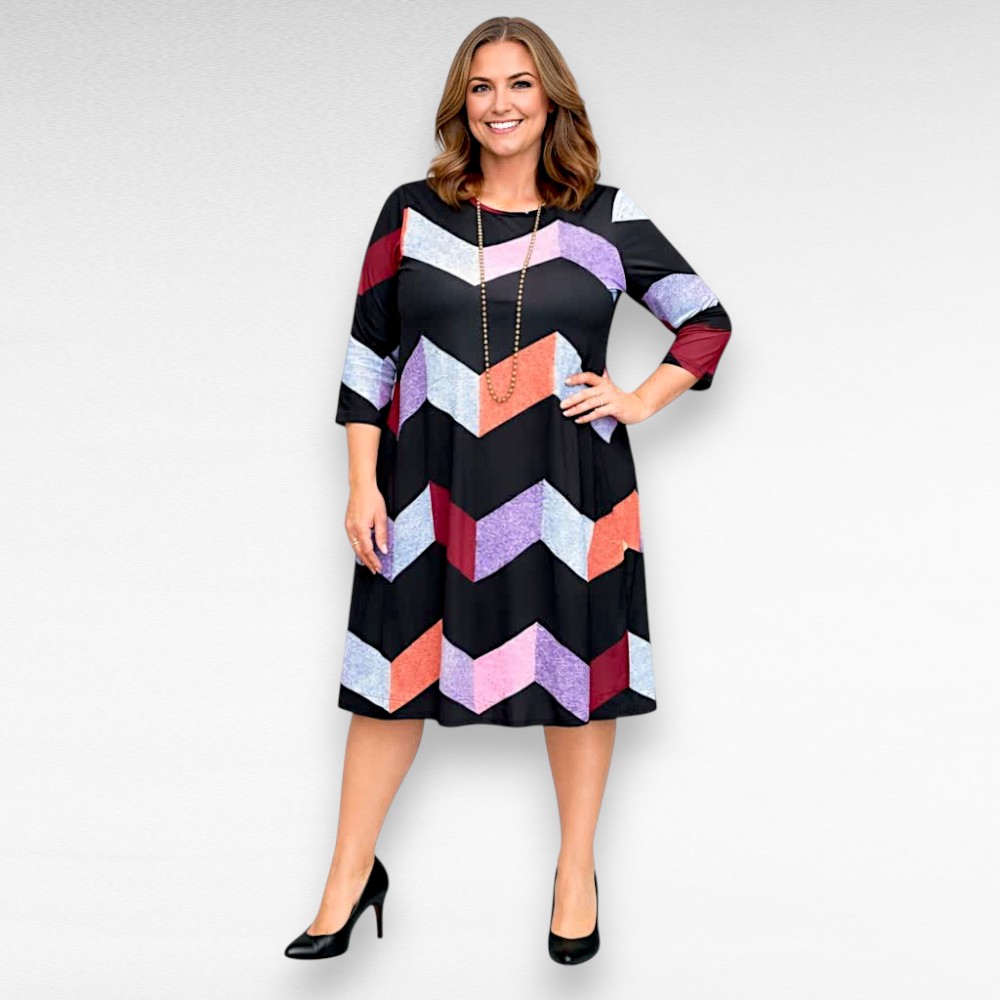 See kleit on loodud selleks, et sa tunneksid end hästi – päriselt. Pehme ja kergelt veniv materjal istub mugavalt seljas, samal ajal kui alt laienev lõige langeb kaunilt ja annab kehale ilusa, naiseliku joone. Roosa*, oranži* ja lillakirju geomeetriline muster lisab värskust ja energiat, ilma et oleks liiga “karjuv”.