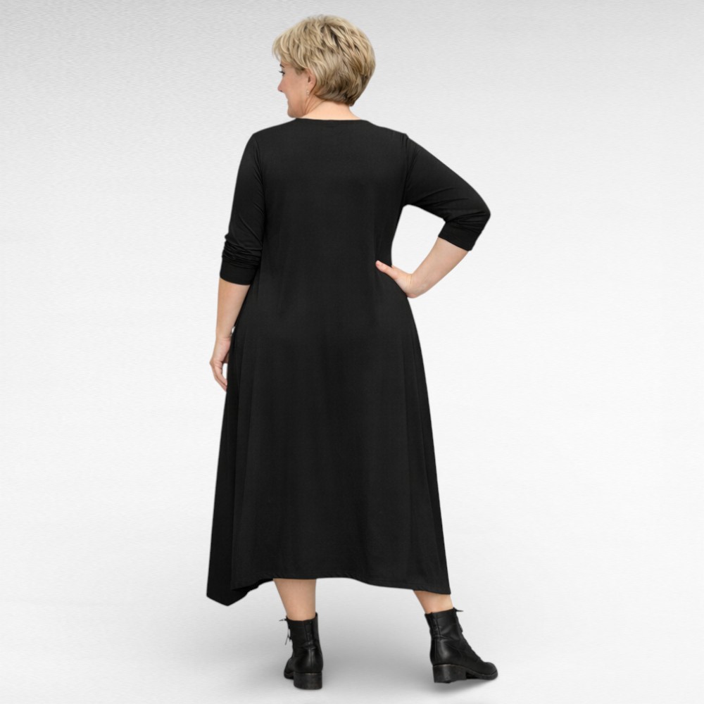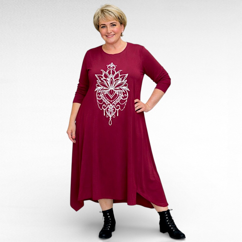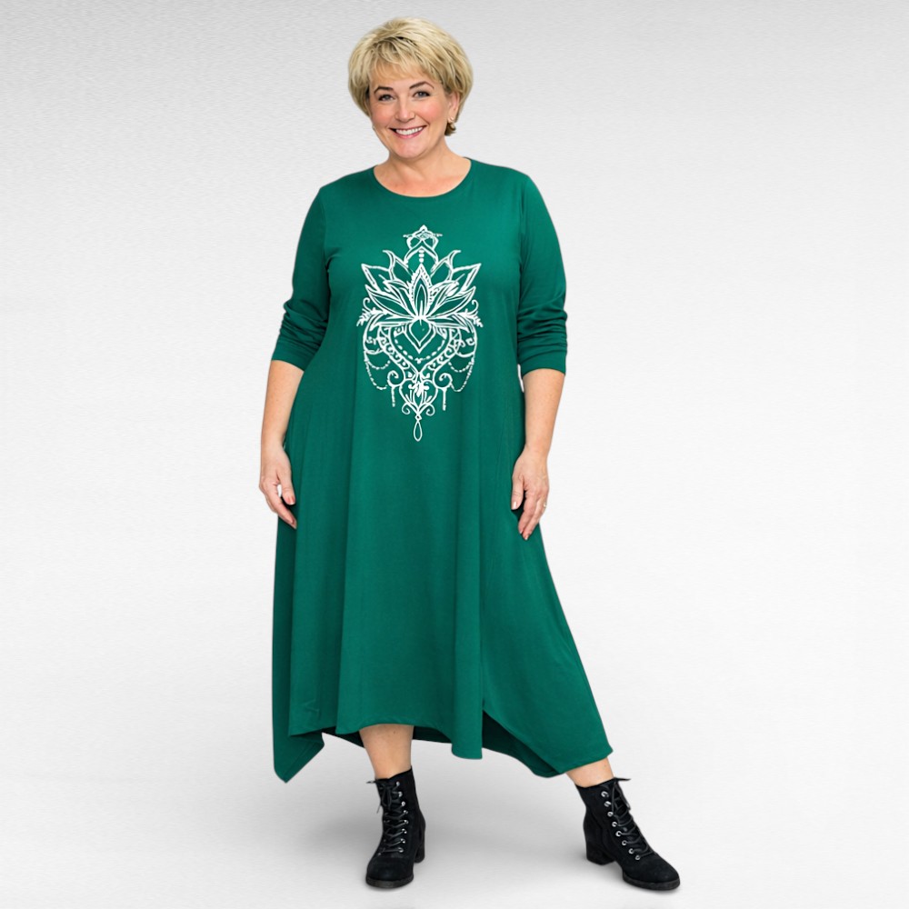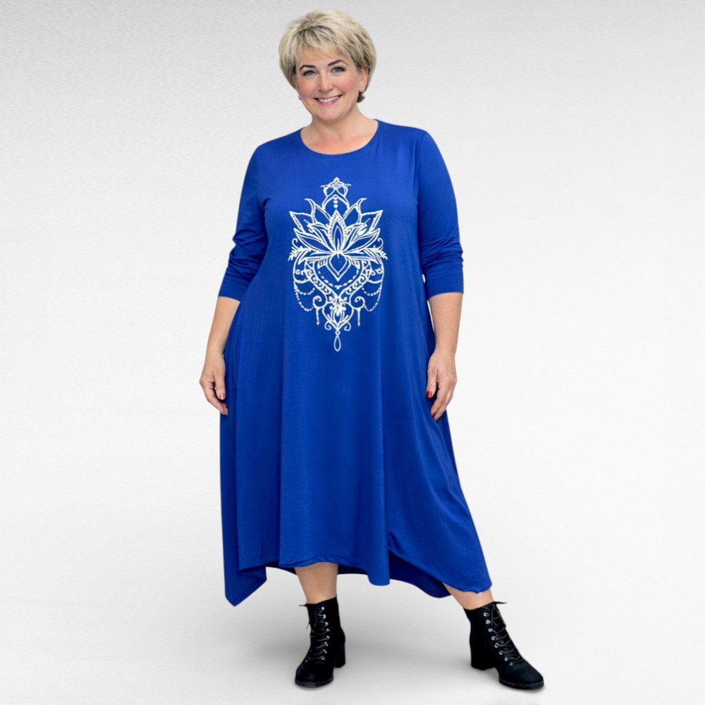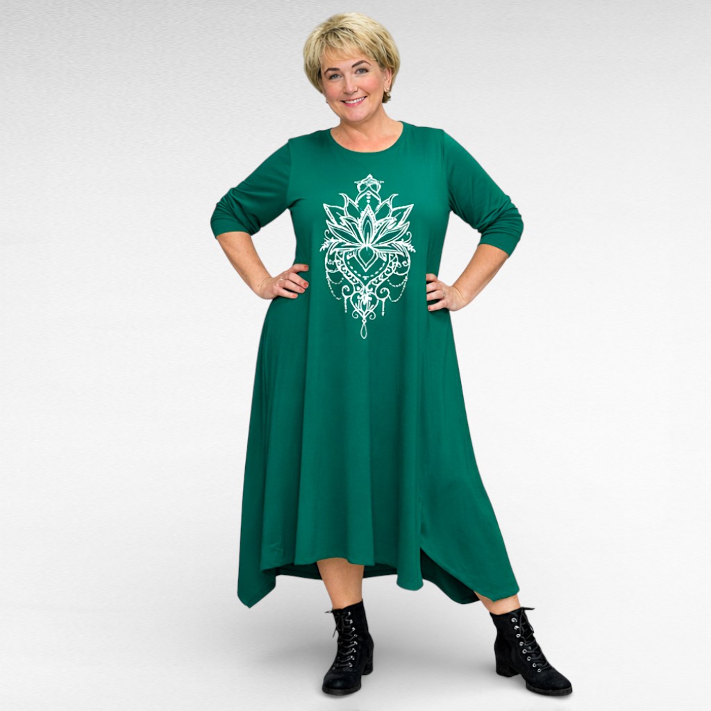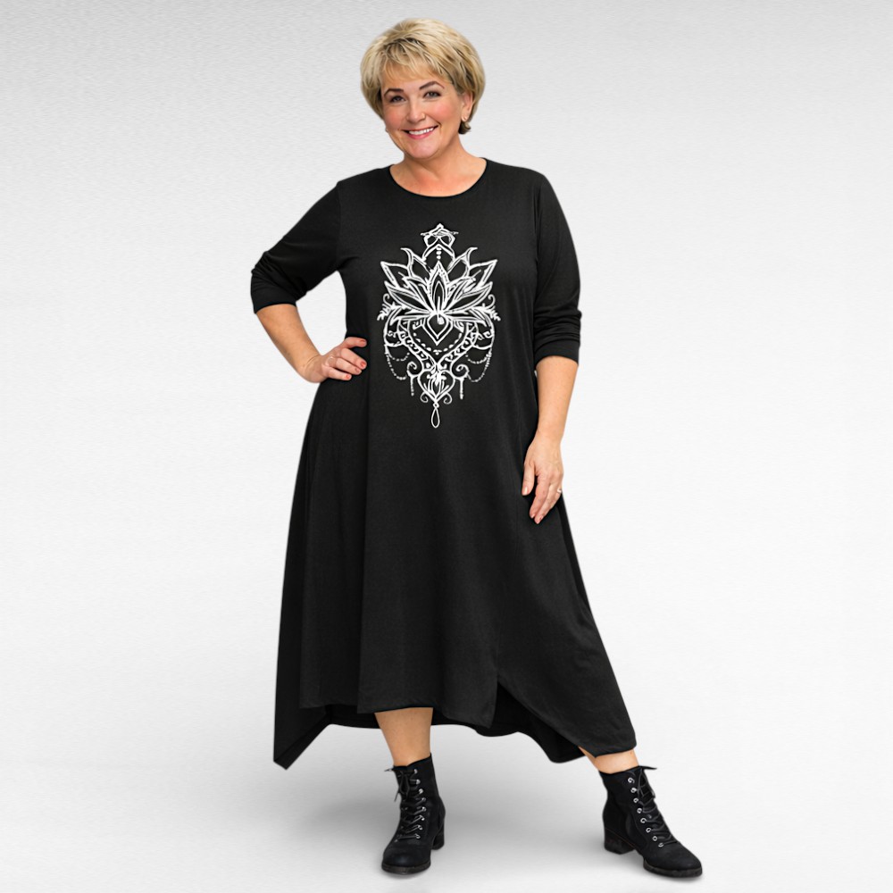 Väga stiilne rinna pealt suure valgekirju õnnetoova mandalamustriga nahasõbralikust puuvilla-ja elastaanisegusest kangast alt laieneva asümmeetrilise lõikega kleit firmalt “Seraj”. Pikad varrukad, ees siilud ja lõhikud. Sobib hästi ka kurvikama puusaga figuurile.