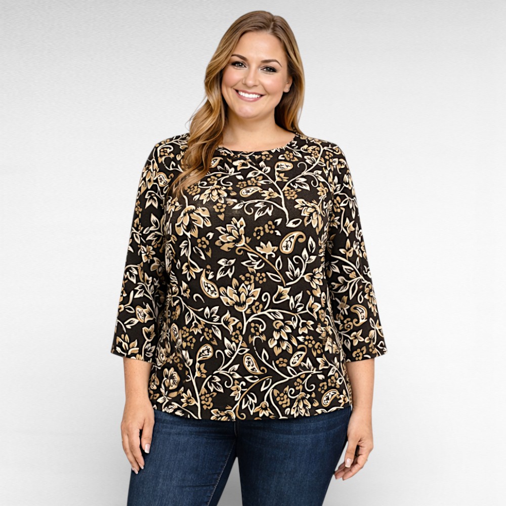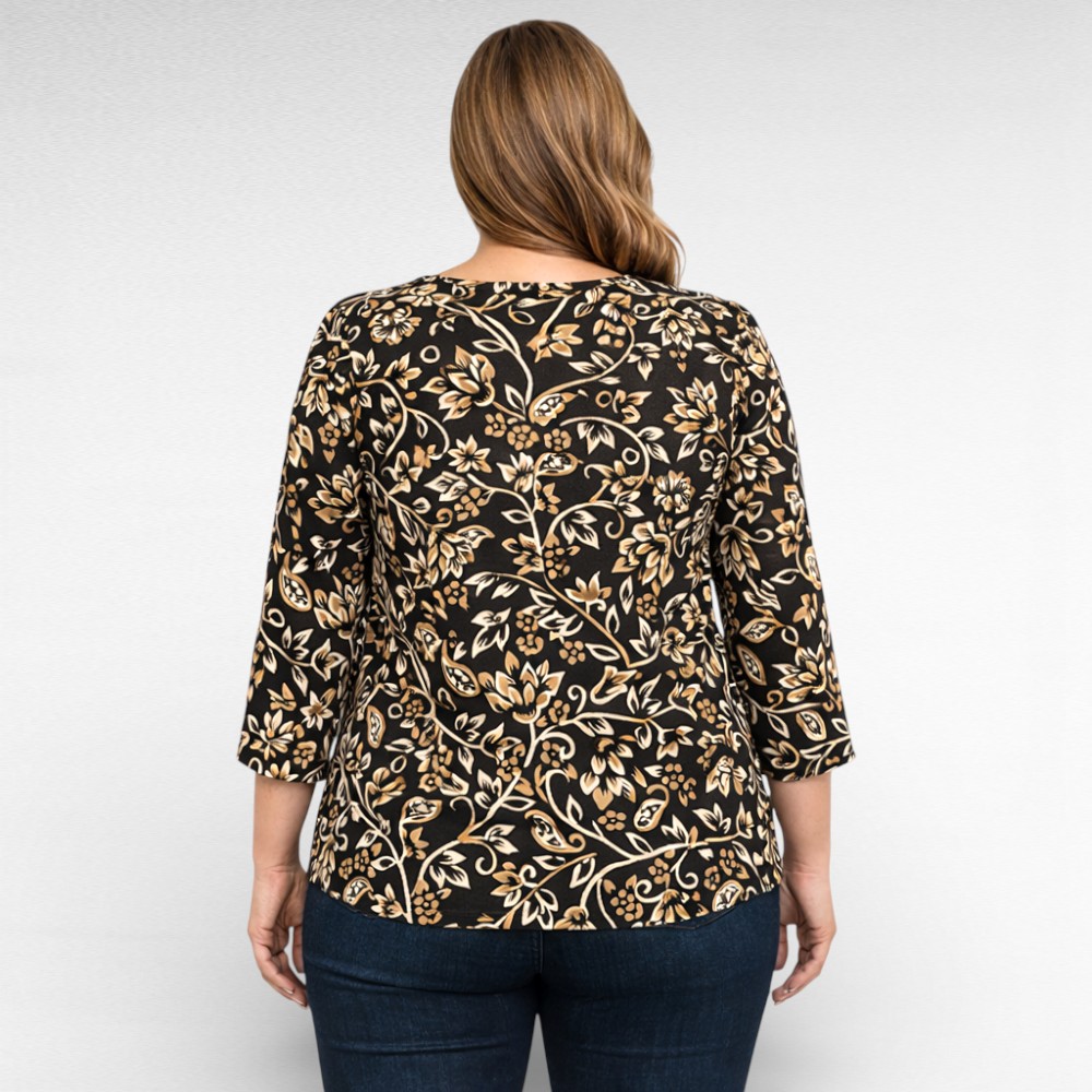 See naiselik pluss suuruses pluus on loodud igapäevaseks kandmiseks, kui hindad pehmet, hingavat puuvilla ja rahulikku, maitsekalt mustrilist stiili. Mustjaspruun moccabeeži- ja valgekirju muster lisab rõivale soojust ja tasakaalu ning sirge lõige koos kolmveerandpikkustega varrukatega sobib suurepäraselt nii pükste kui seelikuga.