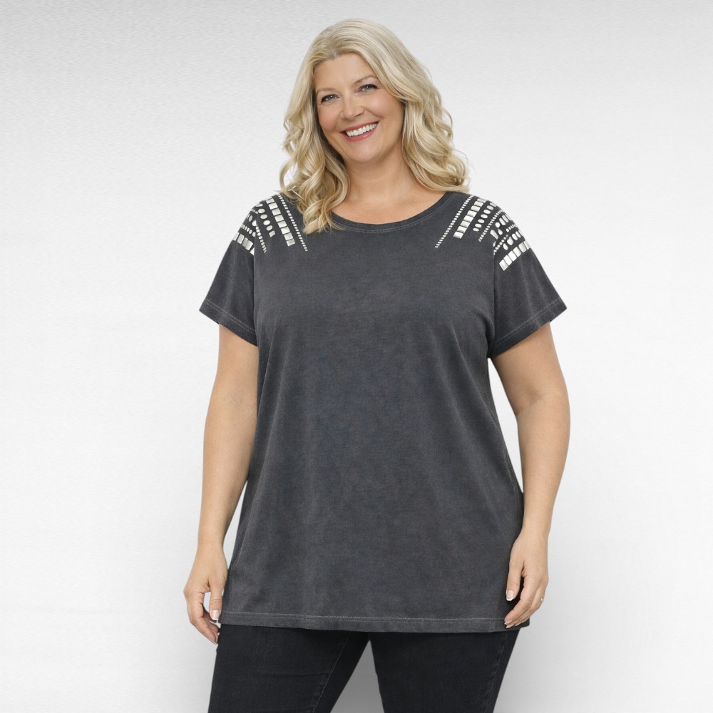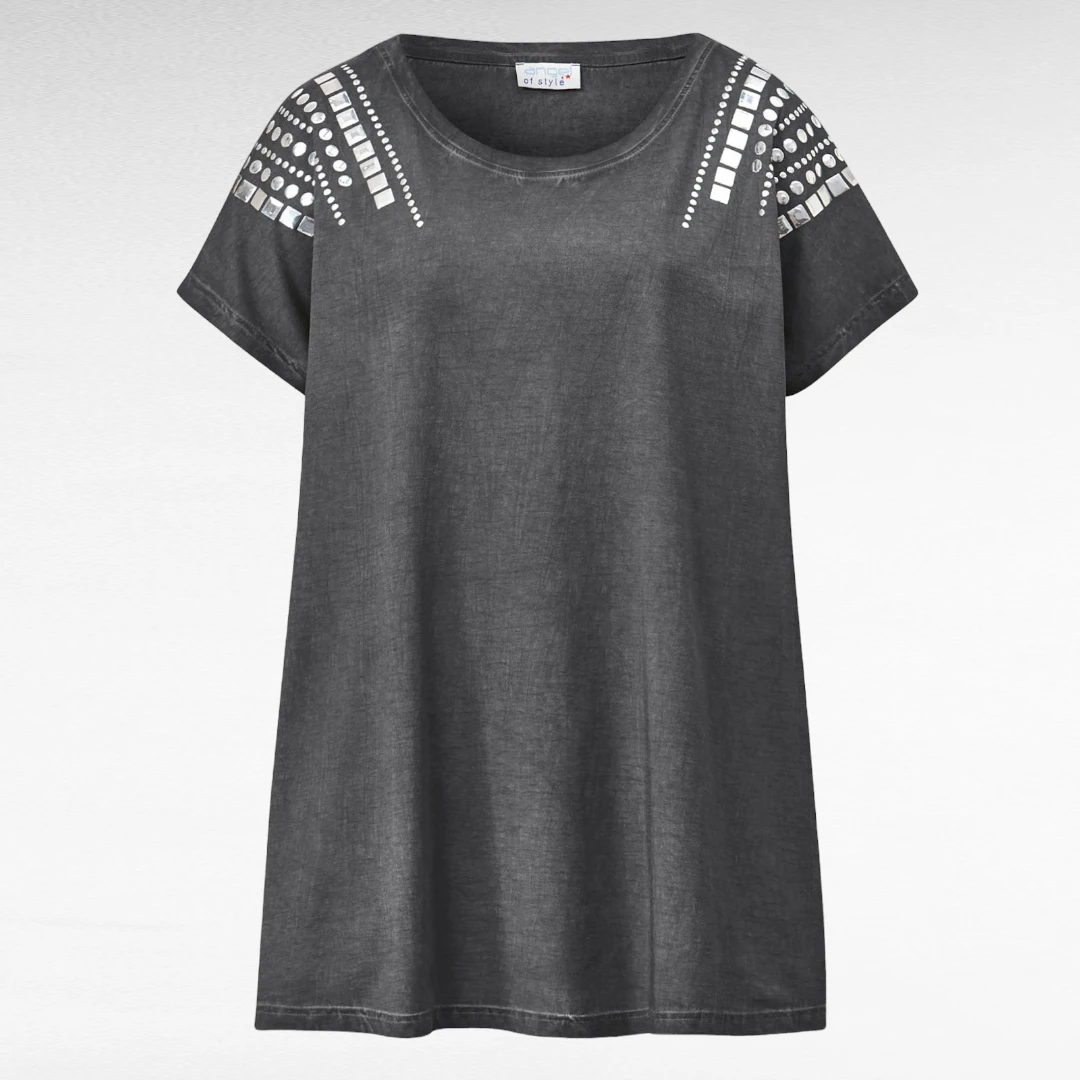Hall hajutatud toonidega õlgade pealt hõbedaste neetidega pikem pluss suurus naiste T-särk/tuunika Inglismaalt firmalt “Angel of Style”. Paksem puuvillane materjal.