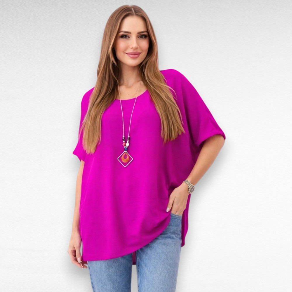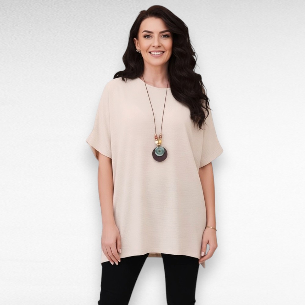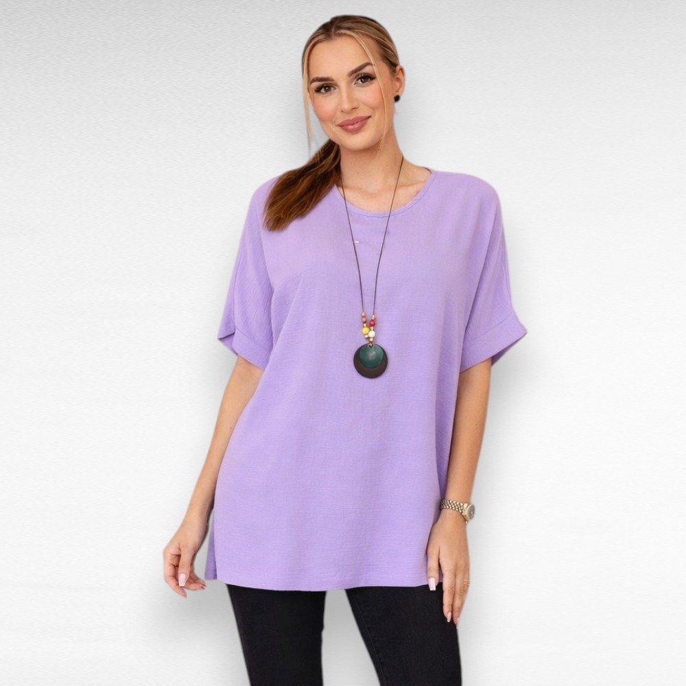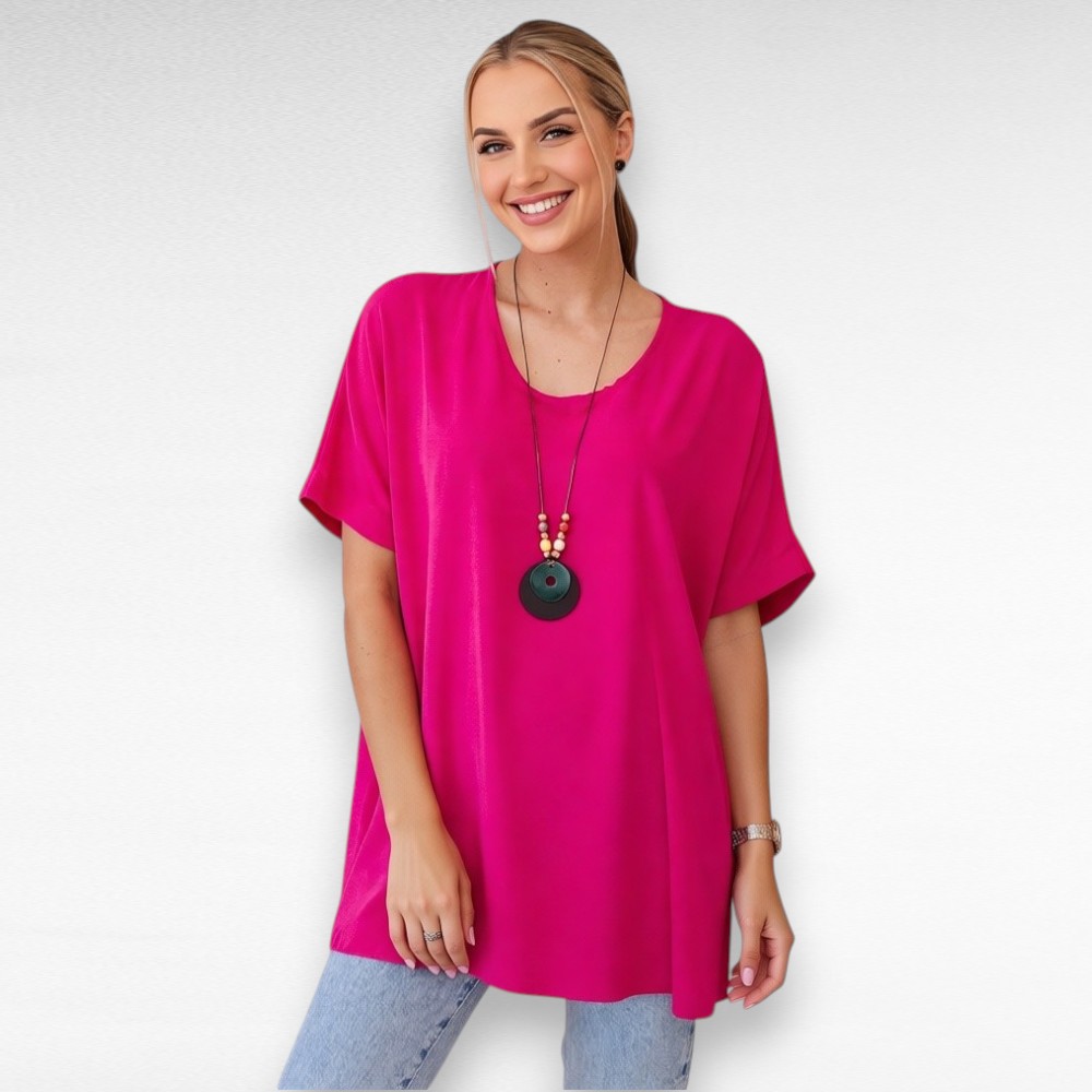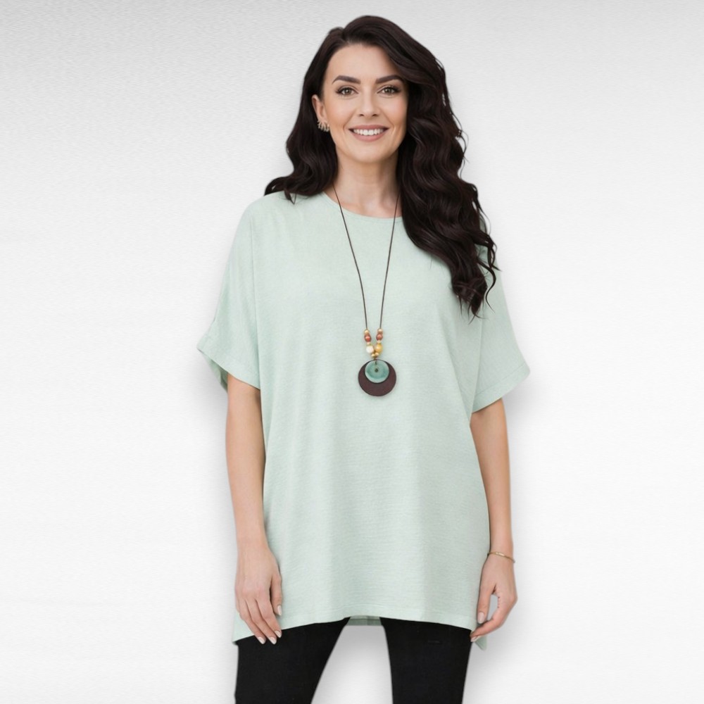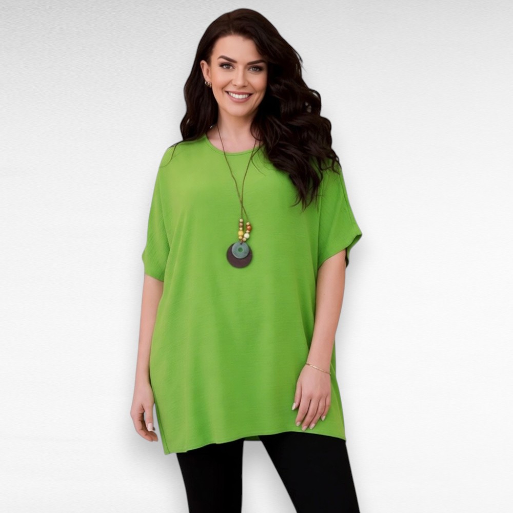 Naiselik ühevärviline lühikeste varrukatega sirge avara lõikega kaelakeega pluus “Italy Moda”.