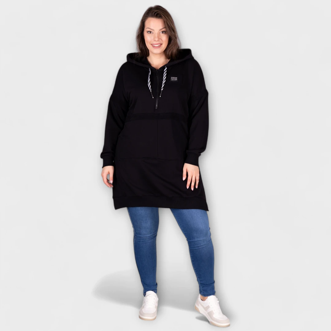 Paksemast puuvillasegusest materjalist must pikk soojem pluss suurus sportliku lõikega kapuutsiga pusa/dressipluus “Womanary”. Üleval väike lukk, külgedel pikad lõhikud. Pikendatud õlaosaga varrukad, kapuutsi ääres kokkutõmmatavad paelad. Sobib hästi teksade või retuuside peal kandmiseks.