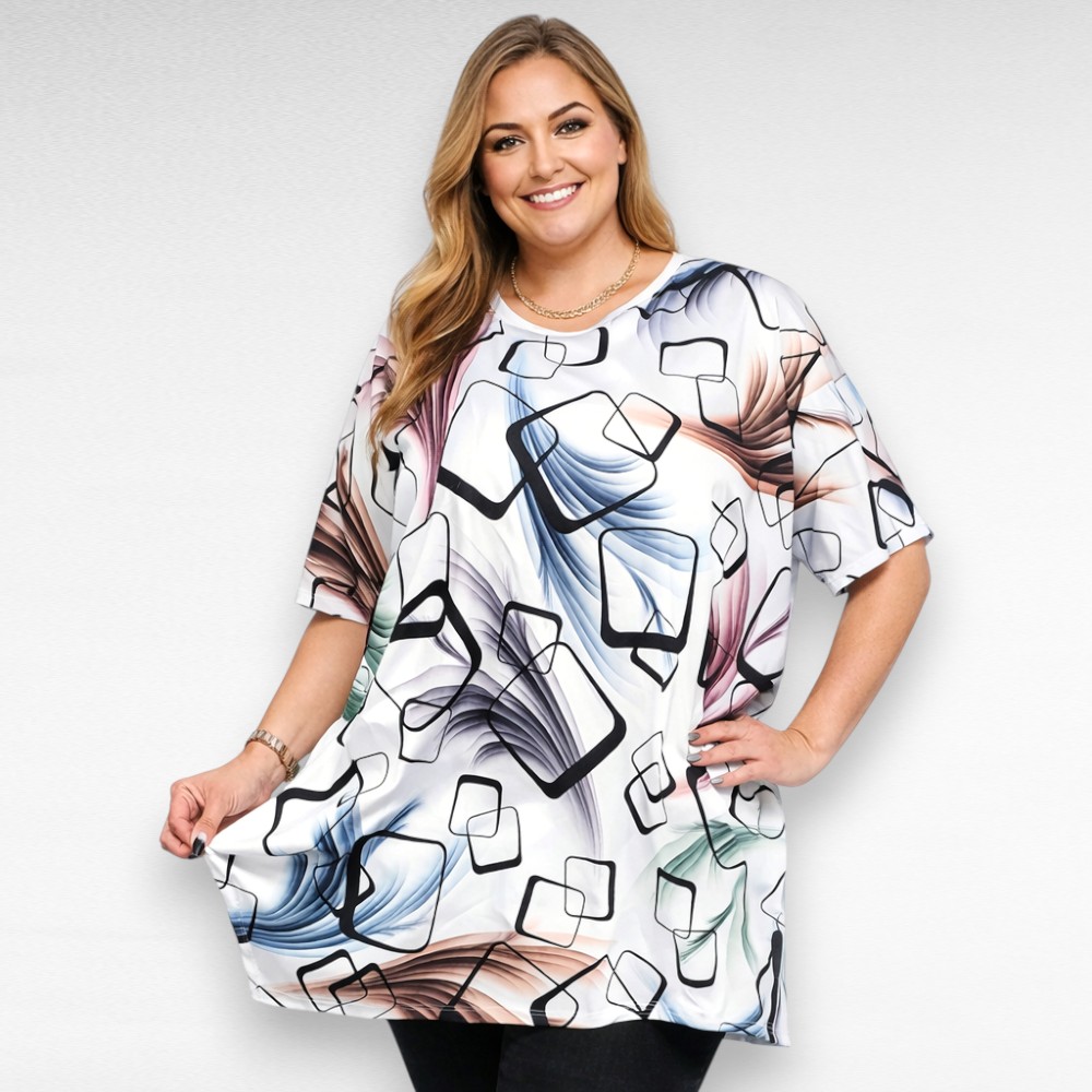 Valge kanditud ümara kaelusega geomeetrilise mustriga siidjast hästilangevast mittekortsuvast materjalist pluss suuruses lühikeste varrukatega pikem pluus/ tuunika “Esmira Fashion”. Allääres väikesed lõhikud, tegumood on alt laienev. Selja tagant on üleni valge.
