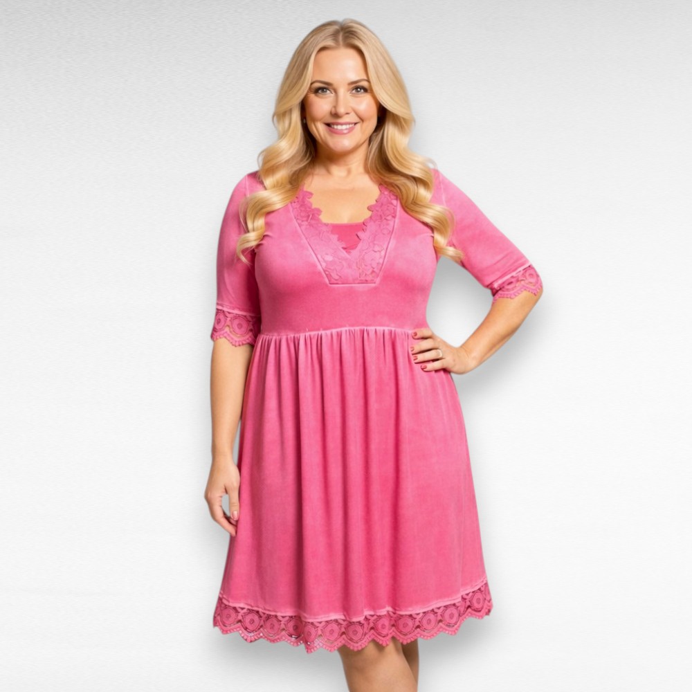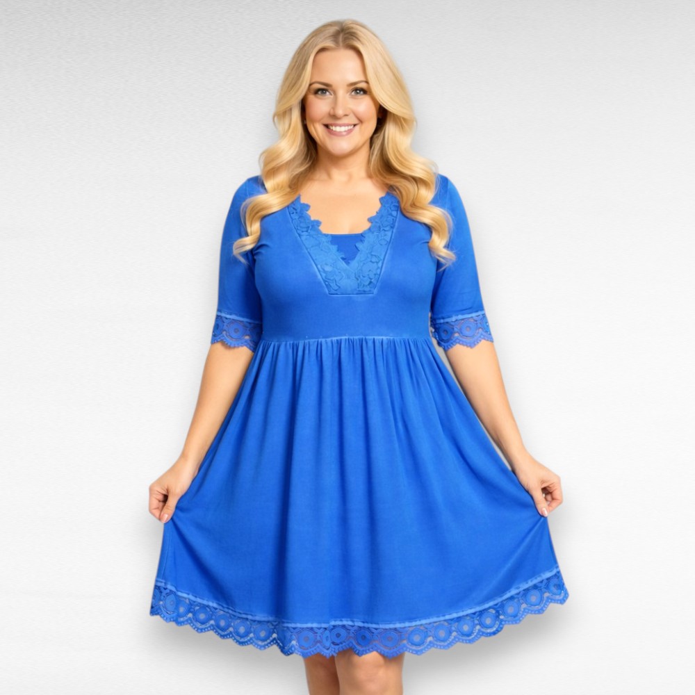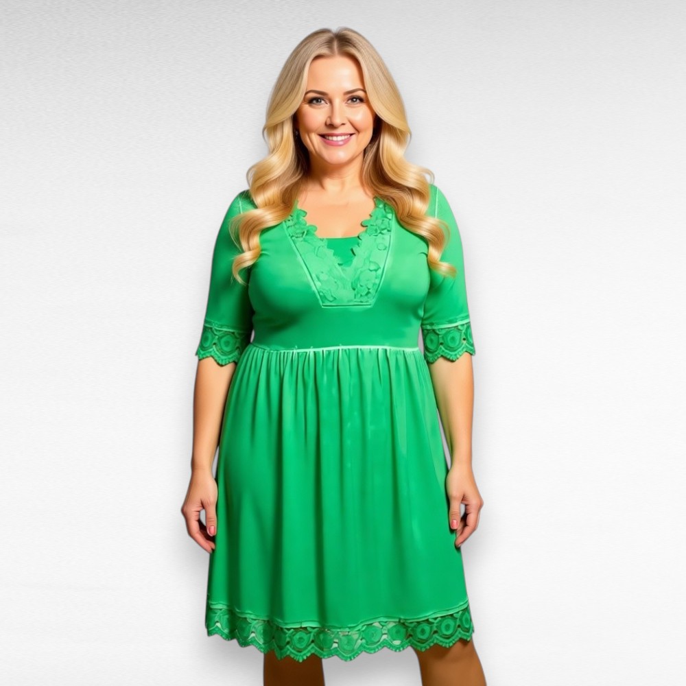 Naiselik poolpikkade varrukatega, pitsiga ääristatud V-kaelusega kleit firmalt “Womanary”. Allääres ja varruka otstes samuti kaunis pits. Väga mõnus stretchikas veniv pehme materjal, ei kortsu. Toonid on sees hajutatult – õmbluste kohad on heledamad. Pikema kasvuga inimesel jääb seljas nagu tuunika.