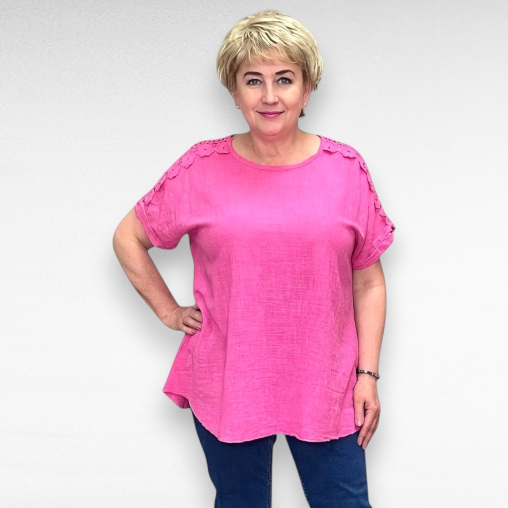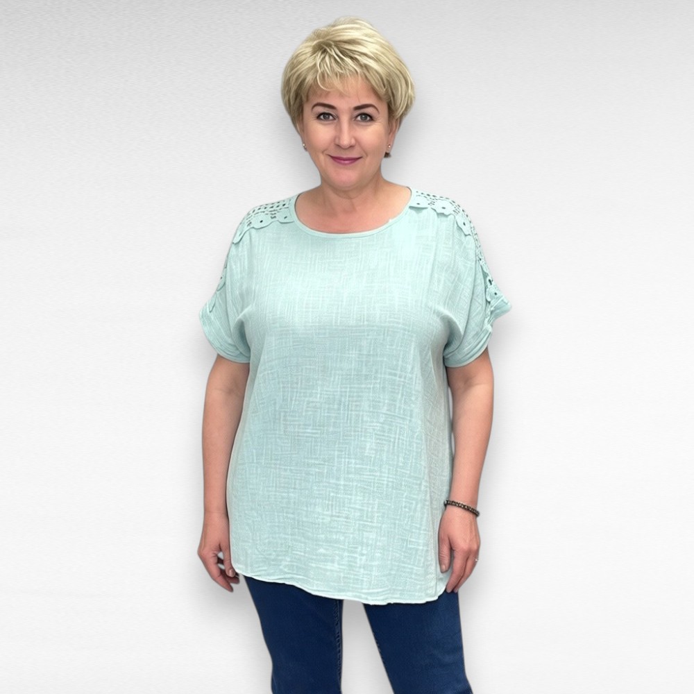 Mõnus suvine puuvillane õla pealt lillelise pitsiga pikem alt laieneva lõikega lühikese varrukaosaga pluss suuruses naiste pluus Itaaliast.