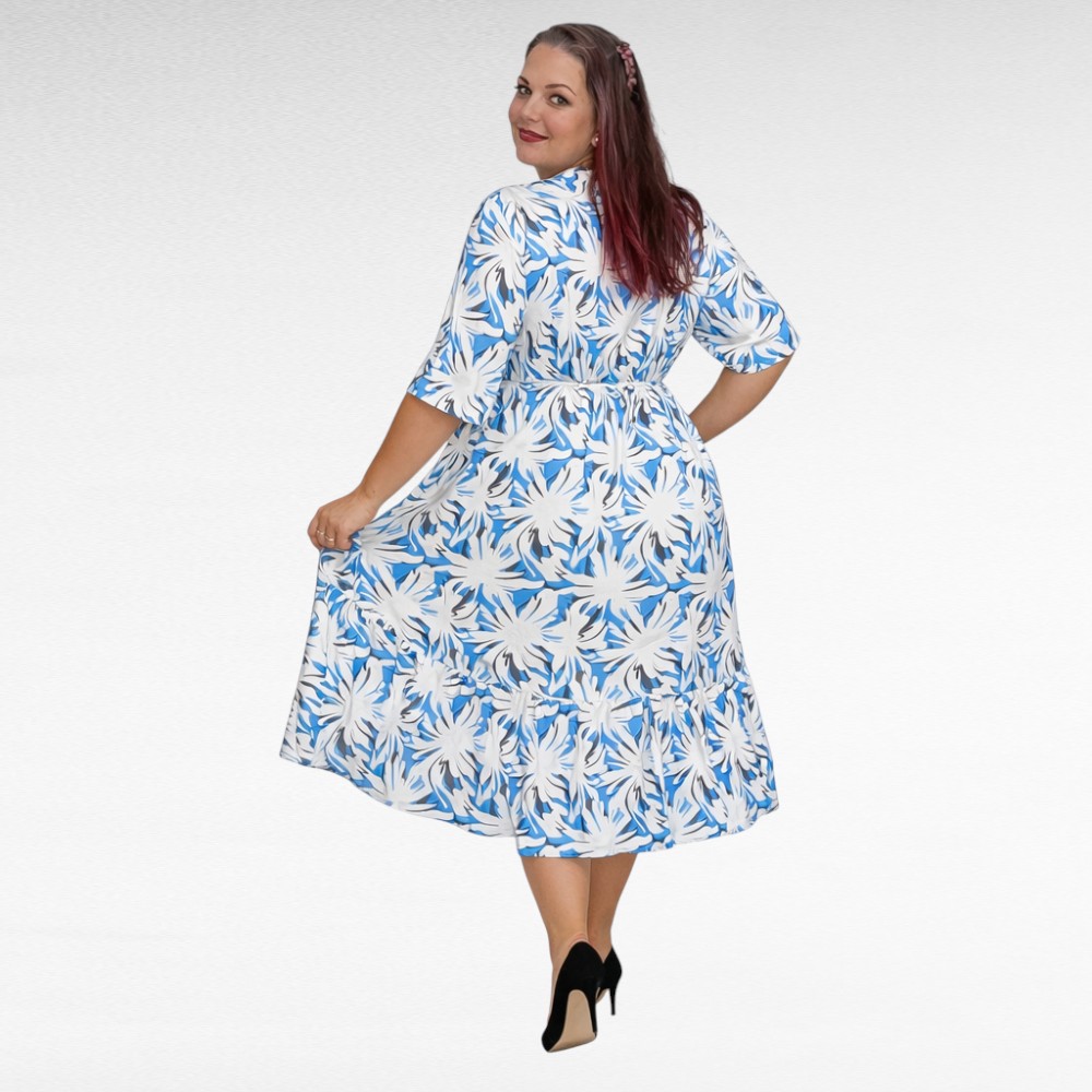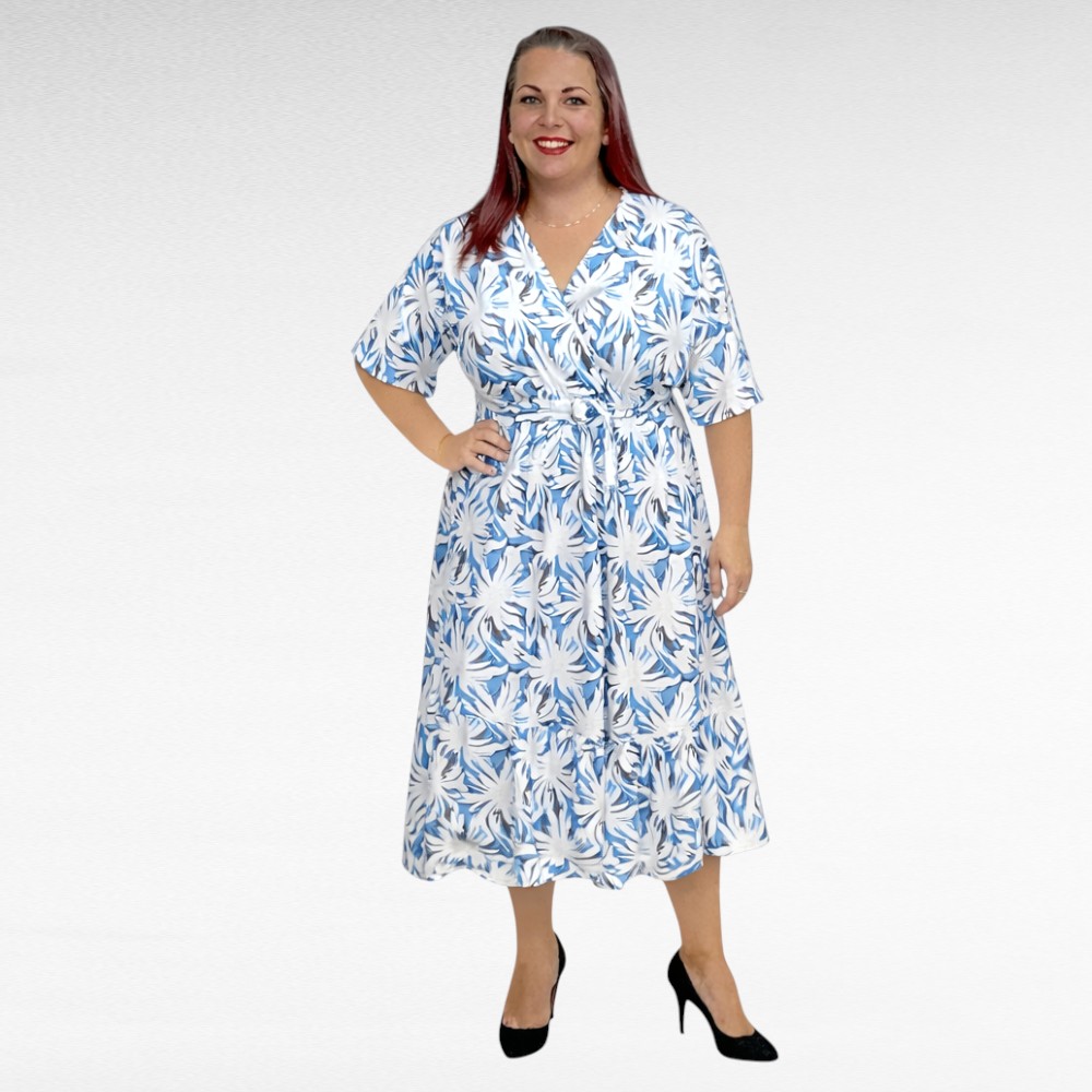 Kaunis valge põhja peal sinisekirju lillemustriga pikem pluss suuruses naiste kleit “Lisette”. Supermõnus materjal- venib, ei kortsu, pehme, läbi ei paista. Rinnaosa on V-kaelusega ja hõlmiklõikega, kleit on keskelt kummiga ja vööga. Puusast on tegumood avar, all naiselik lai sats.