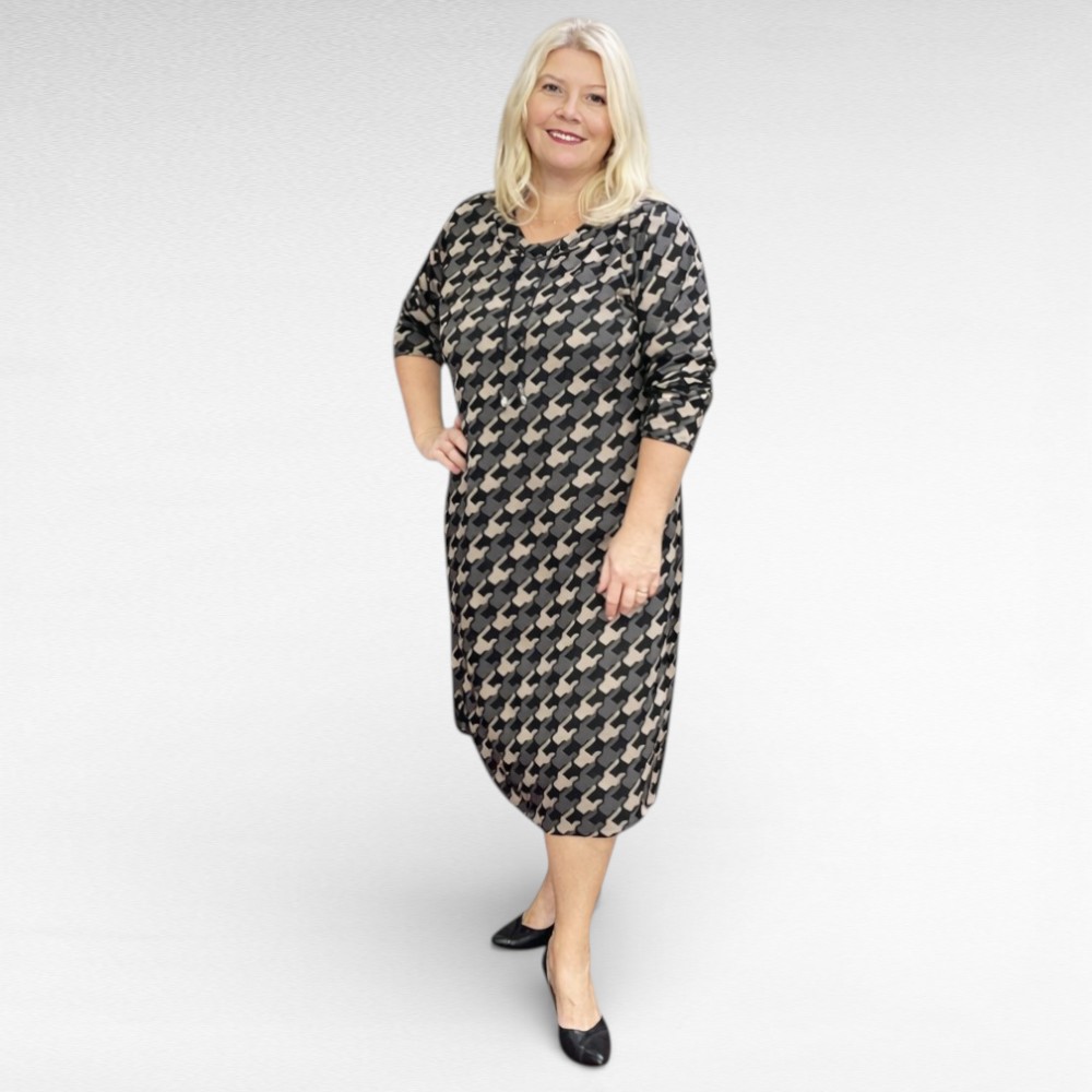 Soe kirju geomeetrilise mustriga igapäevane sirge lõikega kolmveerandpikkusega varrukatega kleit. Altäär on kumer, külgedel lõhikud, ei kortsu. Kaeluse ääres seotavad paelad.