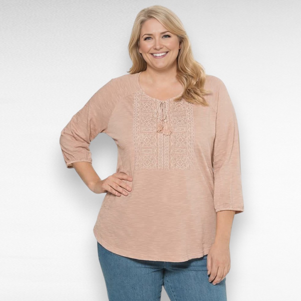 Väga naiseliku tegumoega kreemikasroosat tooni raglaanlõikega eest tikanditega kaunistatud täispuuvillane poolpikkade varrukatega pluss suuruses naiste pluus Inglismaalt firmalt “Ulla Popken”. Varruka otstes kumm, kaeluse ääres armsad tuttidega paelad. Altäär on veidi kaarjas, väga armas pluus.