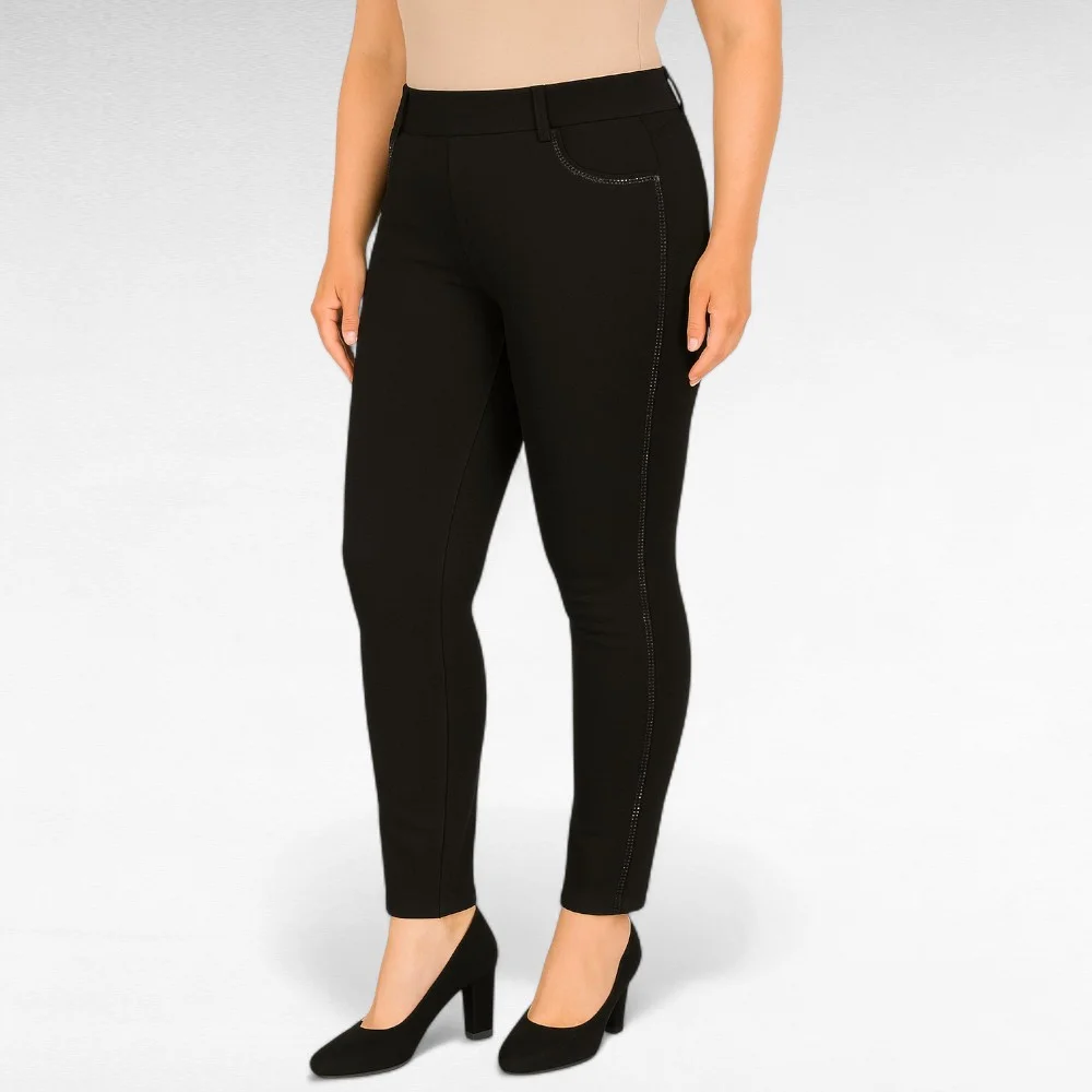 Kvaliteetsest venivast materjalist kõrgema ülaosaga musta värvi külje pealt peenikeste sätendavate tsirkoontriipudega vabaajapüksid firmalt “Kesi”. Ees ja taga taskud, lõige on alt kitsenev.