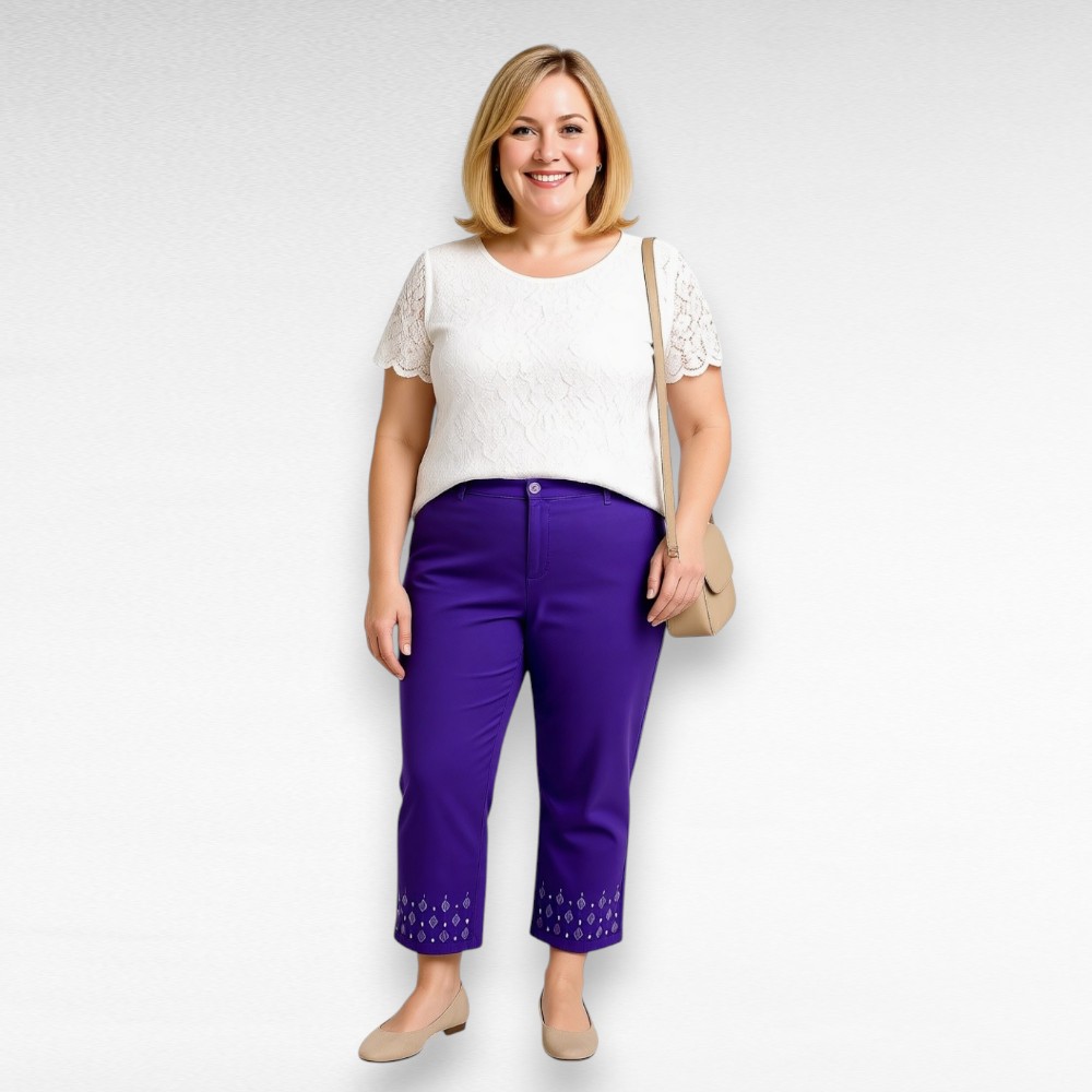Väga ilusat tumelillat tooni kolmveerandpikkusega alt helmestega kaunistatud sirge sääreosaga pluss suuruses naiste suvepüksid Inglismaa firmalt “Evans”. Kinnituvad luku ja nööbiga, mugav kõrgem ülaosa.