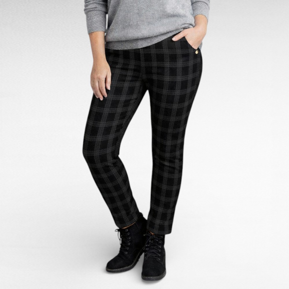Viisaka lõikega kõrgema ülaosaga mustaruudulise mustriga seest õhema fliisvoodriga taskutega retuuspüksid “FYV”. Sobivad keskmisele kasvule-alates 165cm. Taskute peal väike hõbedane kaunistus. Sobivad jahedamate ilmadega käimiseks.