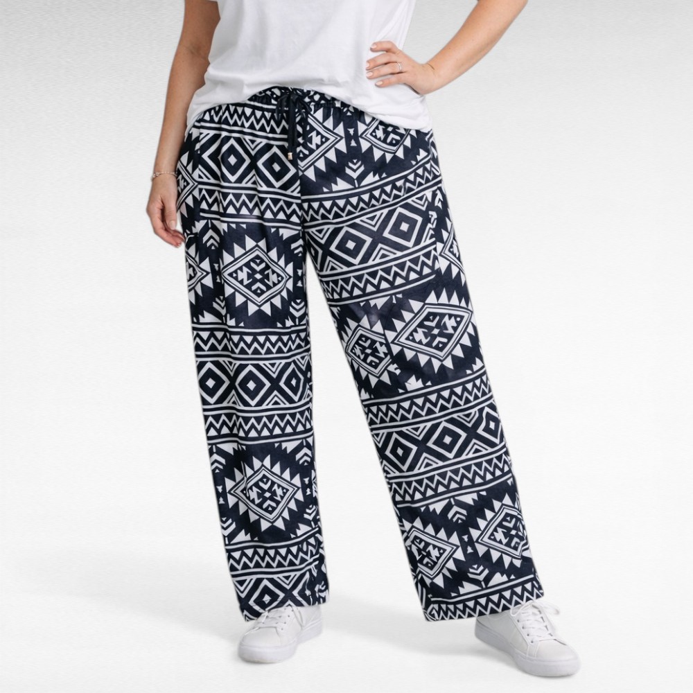 Musta-ja valgekirju geomeetrilise mustriga avara lõikega vöökohast kummiga ja väikese ilulipsuga siidjast materjalist pluss suuruses naiste suvepüksid. Taskuid ei ole.
