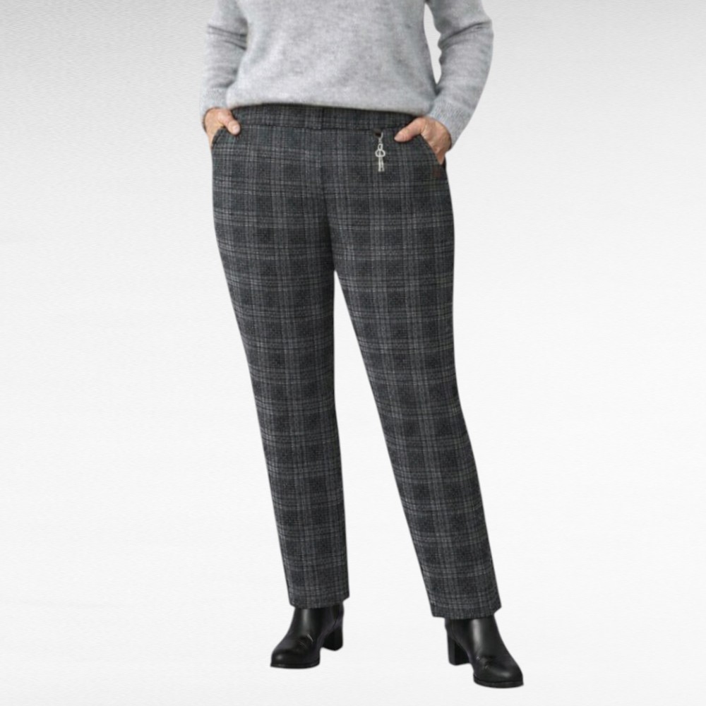 Viisaka lõikega pehmest materjalist kõrgema ülaosaga halliruudulise mustriga seest fliisvoodriga taskutega retuuspüksid “FYV”. Sobivad lühemale kasvule-kuni 165cm. Taskute peal väike hõbedane kaunistus. Sobivad jahedamate ilmadega käimiseks.