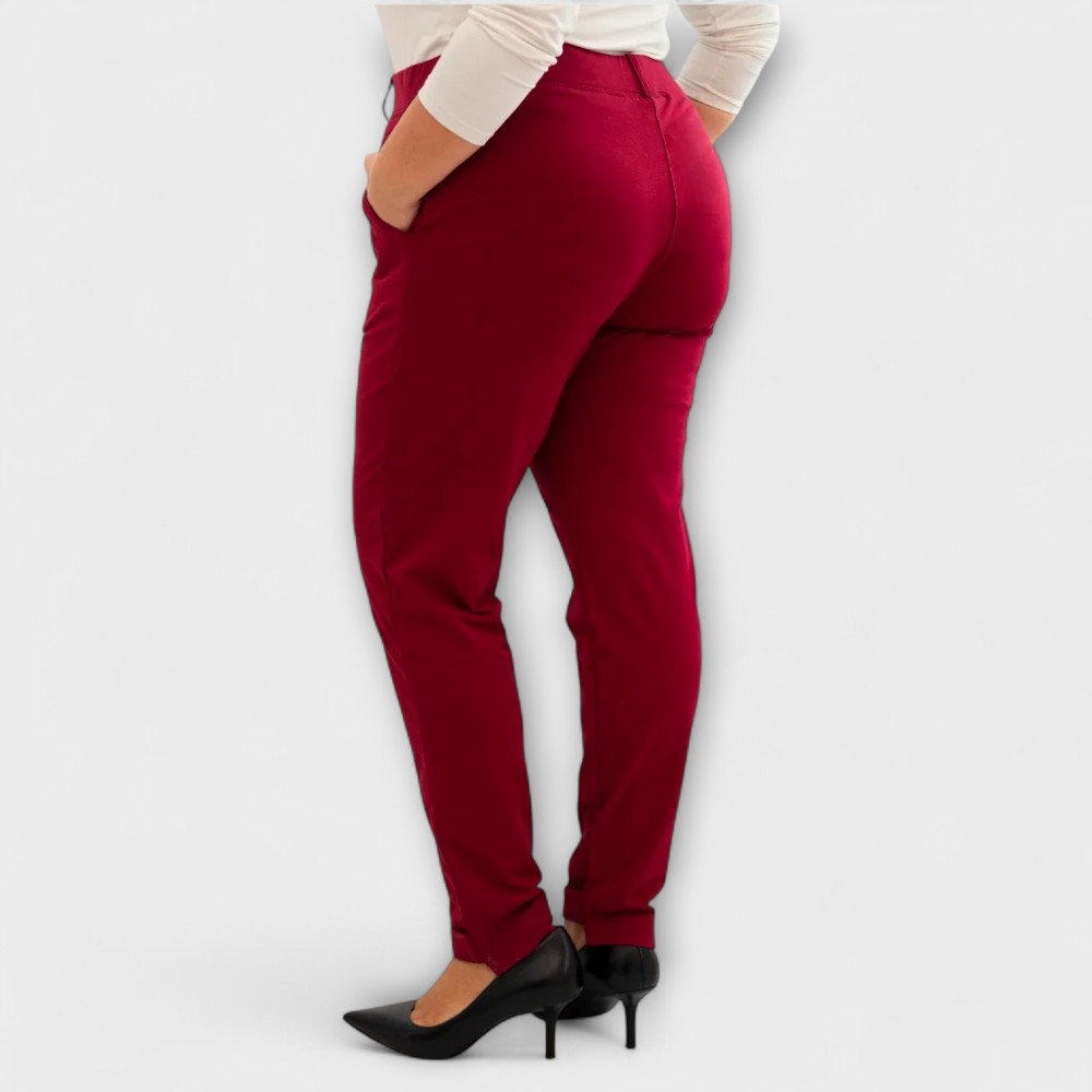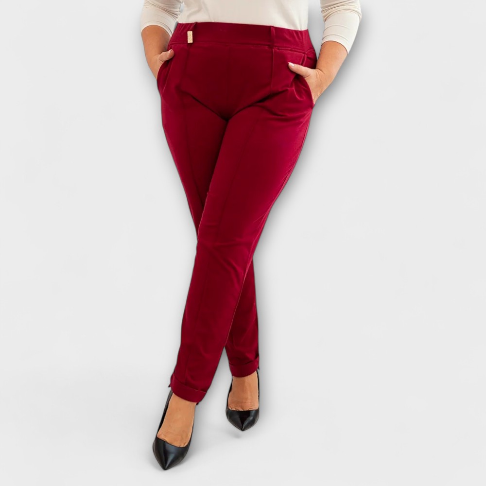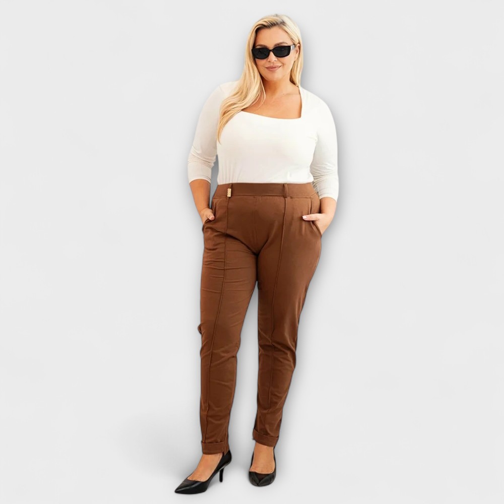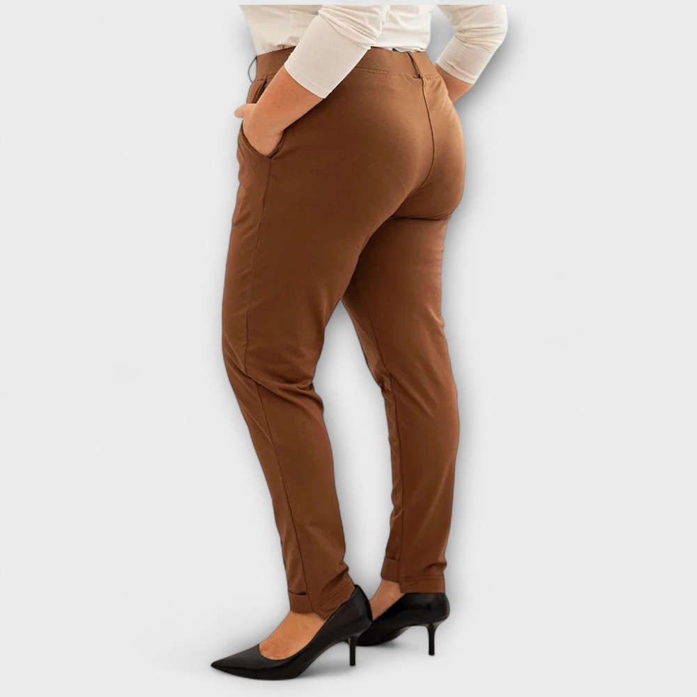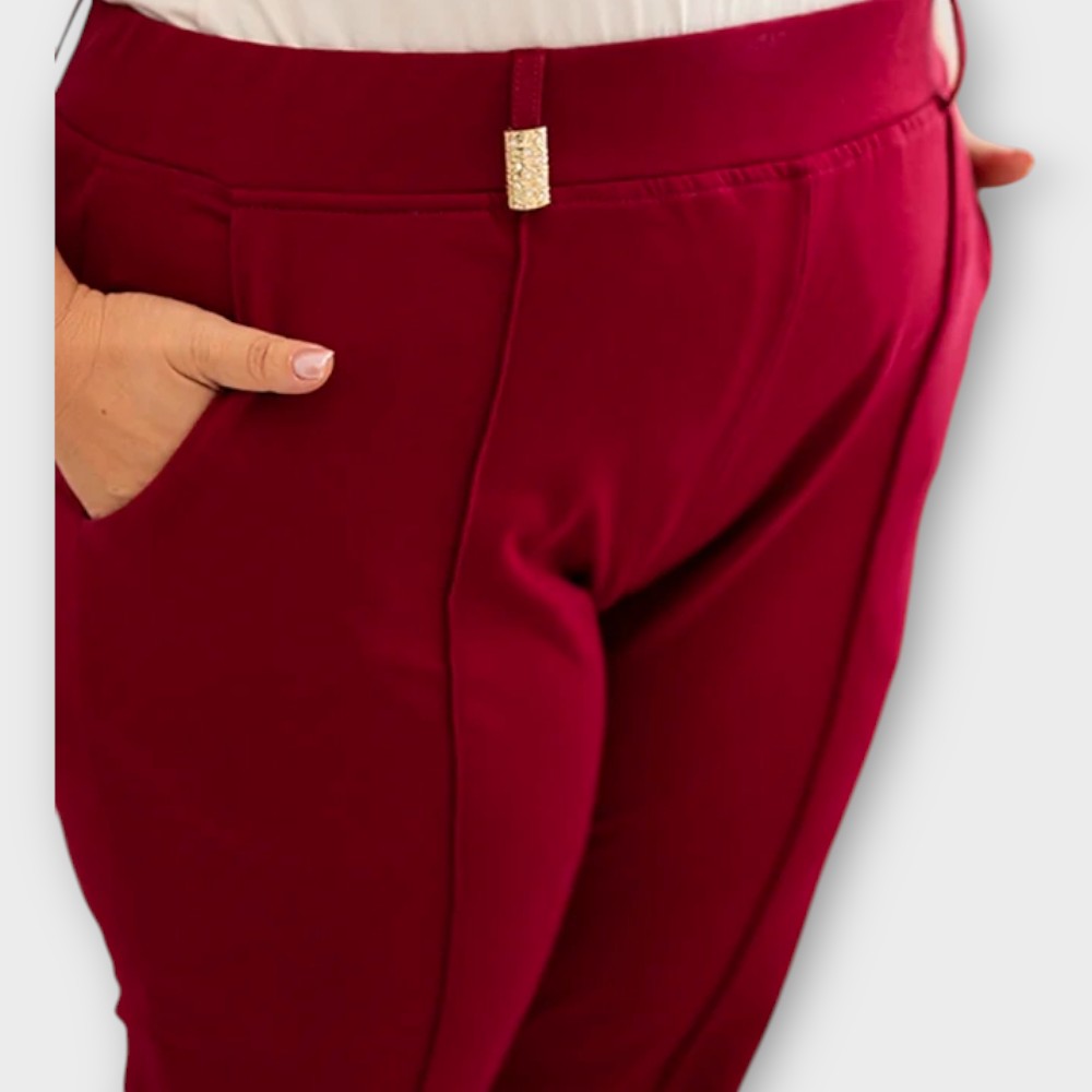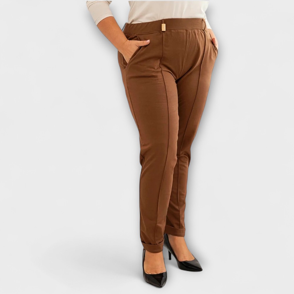 Need elegantsed naiste püksid on loodud selleks, et teha sind iga päev kaunimaks ja naiselikumaks. Pehme ja hingav kangas paitab nahka ning tänu elastaanile istuvad püksid jalas justkui valatult, pakkudes vabadust ja liikumismugavust kogu päevaks. Elastne värvel lisab veelgi mugavust juurde ja pole vaja mõelda ei lukkudele ega nööpidele ning funktsionaalsed küljetaskud lisavad praktilisust. Kergelt alt kitsenev säär loob modernse ilme, samas kui klassikaline lõige tagab ajatuse – need püksid sobivad hästi nii tööpäeva nõudlikku rütmi kui rahulikesse hetkedesse sõprade või perega. Kombineerides neid pidulikuma pluusiga võid nendega vabalt minna ka pidulikule üritusele. Pükstel on eest sisseõmmeldud viigid, üleval on vööaasad ja ühel vööaasal on armas kuldne sätendavate kivikestega kaunistus.