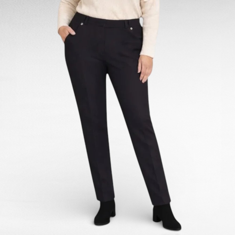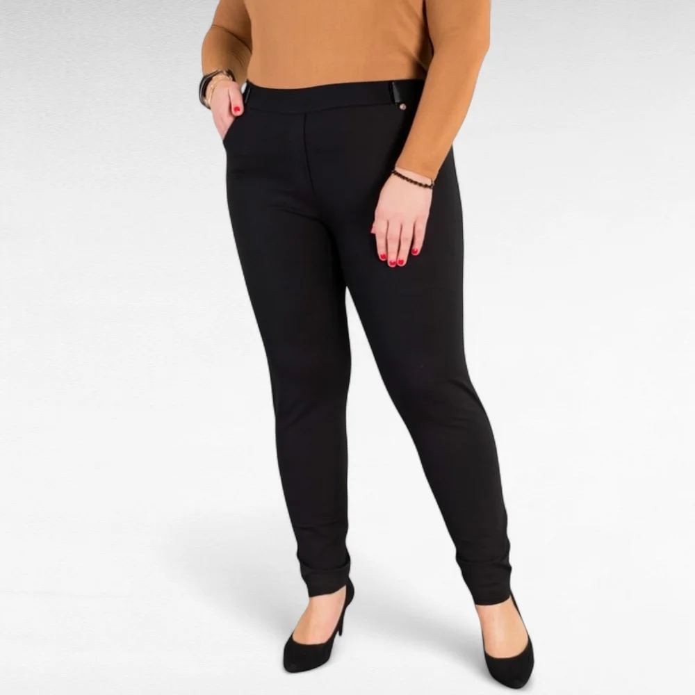 Supermugavast venivast stretchikast materjalist igapäevased kõrgema ülaosaga musta värvi taskute pealt kuldsete neetidega vabaajapüksid. Ees ja taga taskud, vöökoht on kummivärvliga, lisaks on ka vööaasad.