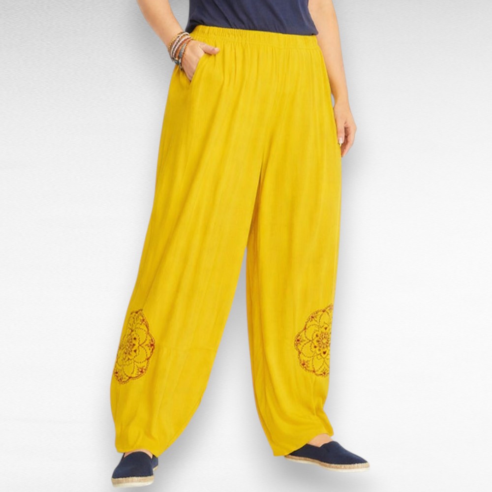 Lahedad avara lõikega kollased kortsuriidest tikanditega suvised pikad püksid Inglismaalt firmalt “BPC”. Sääre peal all suur efektne tikand. Vöökoht on kummiga, külgedel taskud. Pükste sääreosa on avar ja alt läheb kitsamaks, et kukuks jalalaba peale. Sobivad pikemale kasvule – palun jälgige mõõte!