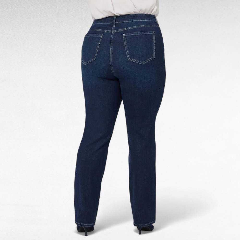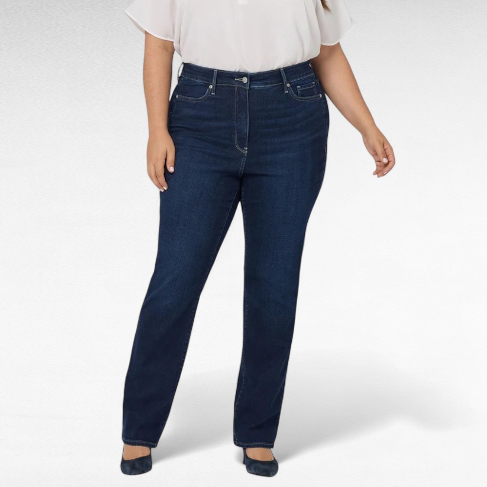 Tumesinised kõrgema ülaosaga sirge lõikega teksapüksid pluss suurus naistele firmalt “G-Smack”. Hästiveniv stretšikas materjal. Eest kinnituvad luku ja neediga, ees ja taga taskud. Ees taskutel peal väikesed needid.