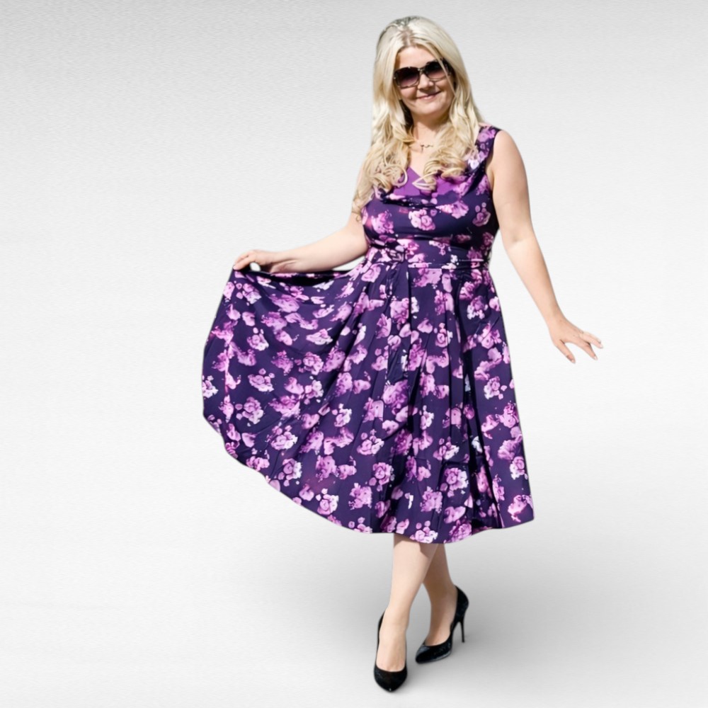 Retrohõnguline lillakirju mustriga keskelt vööga suvekleit Inglismaalt firmalt “Anmol”. Alt laienev naiselik tegumood, külje peal lukk. Vöökoht on läbilõikega ja kõvasti kroogitud, seetõttu on ka puusaümbermõõt suur. Väga kena kaeluseosa. Pikkus jääb pisut allapoole põlve.