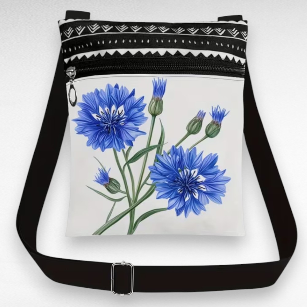 Stiilne ja praktiline valge õlakott rahvusliku kauni rukkilillemustriga. Kotil on tugev musta värvi reguleeritav õlarihm, hõbedased tõmbelukud ning kaks lukuga sahtlit. Täiuslik igapäevaseks kasutamiseks või kingituseks looduse ja lillede armastajale.