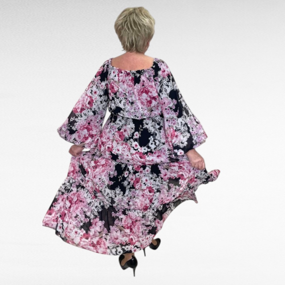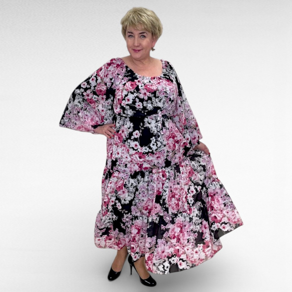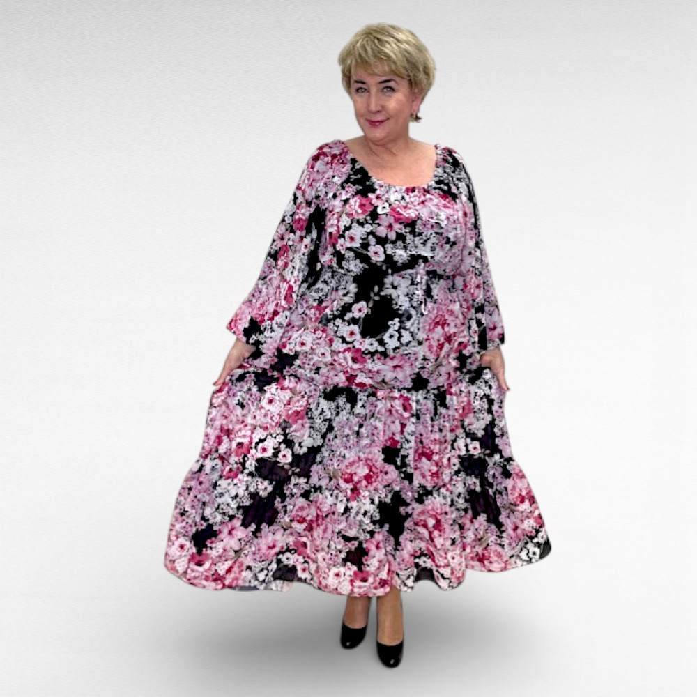 Õhulisest lendlevast kangast kehaosast voodriga luksuslik satsiline must kauni väikese roosalillelise mustriga pluss suuruses pikk satsiline raglaanlõikega kleit. Kleit on kolmveerandpikkusega alt kõvasti laienevate varrukatega. Vöökoht on kummiga ja seotava vööga. Vöökoht on veniv ja alt tegumood veidi laienev. Seelikuosa on naiselikult satsiline ja voogav. Pikkus jääb peaaegu maani, kaunis nelinurkne väikese satsiga kaelus ees ja taga.