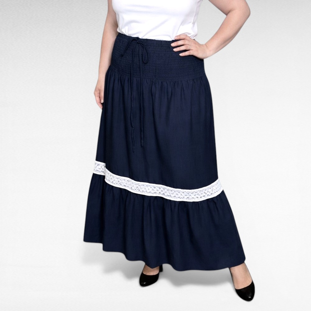 Suvine pikk tumesinine satsiline valge pitsiga kaunistatud teksalaadsest pehmest materjalist seelik. Vöökoht on peenikeste kummidega ja kokkuseotava lipsuga, tegumood läheb puusast kõvasti laiemaks.