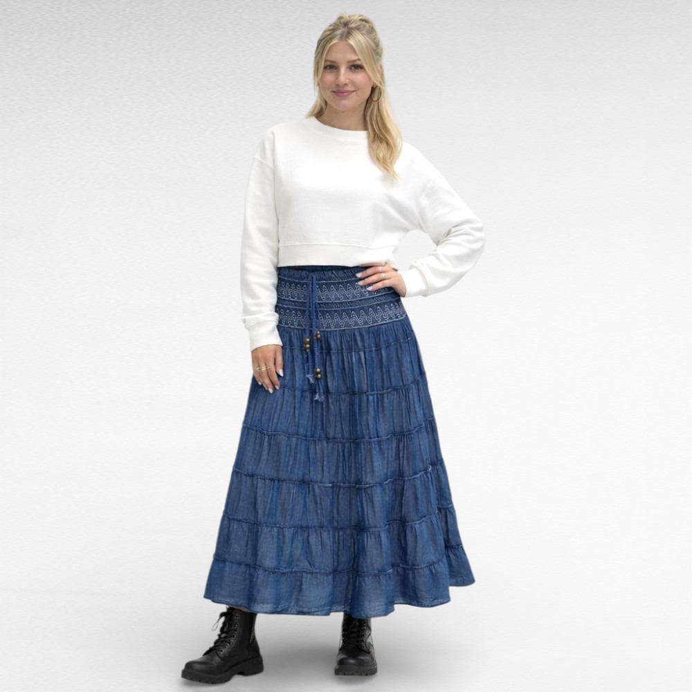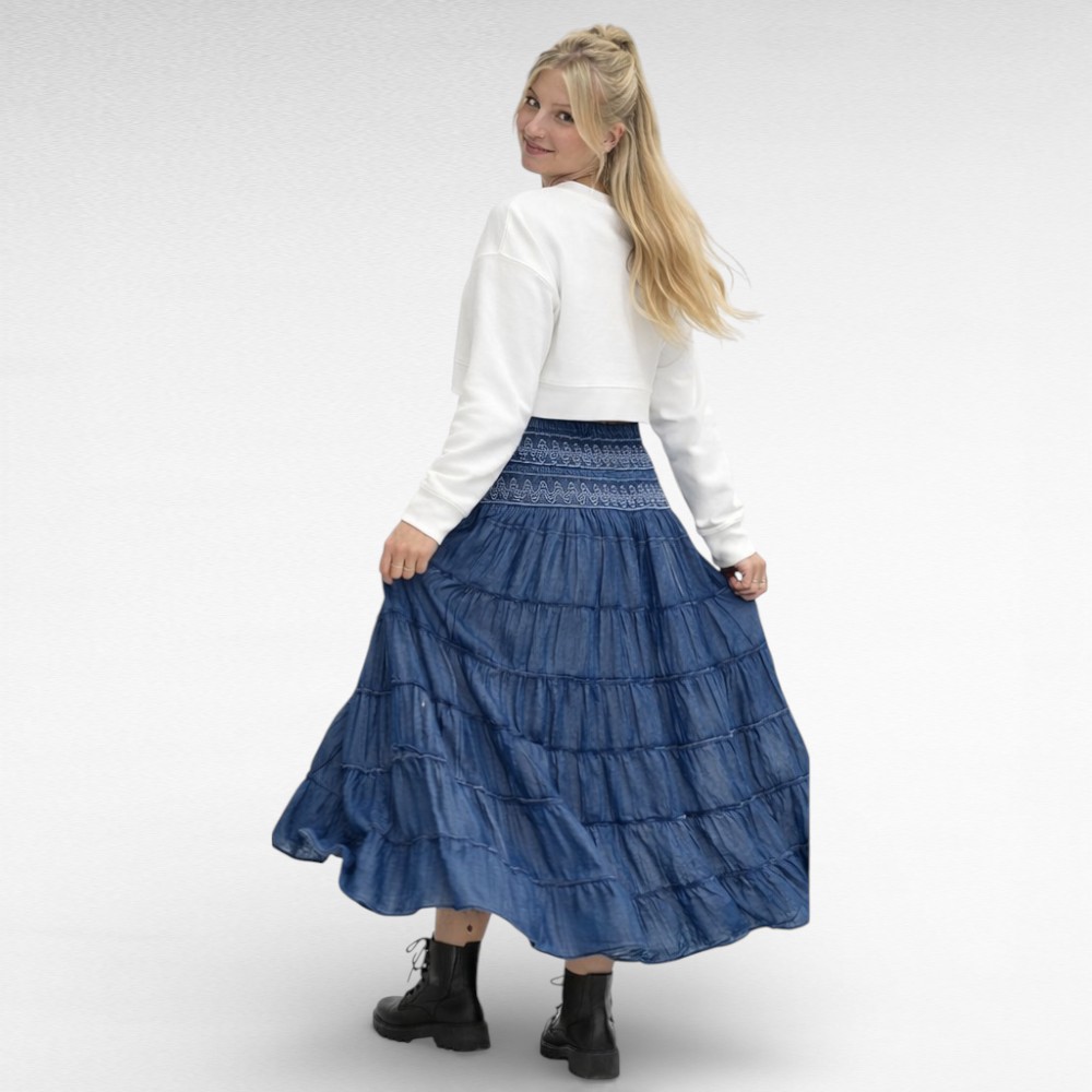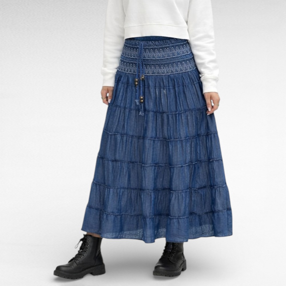 Õhemast teksalaadsest materjalist vöökohast peenikeste kummidega ja seotavate paeltega alt laienev satsiline tumesinine suvine maksiseelik “Airisa”. Vöökoht on veniv ja puus on avar. Sobib kanda ka kleidina. Suvel saab kanda õhukese topi või pluusiga ja talve saab kombineerida erinevate sviitrite ja kardiganidega.