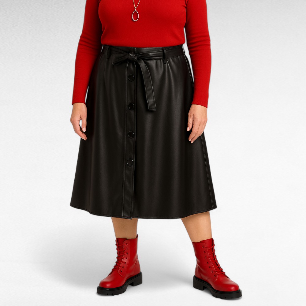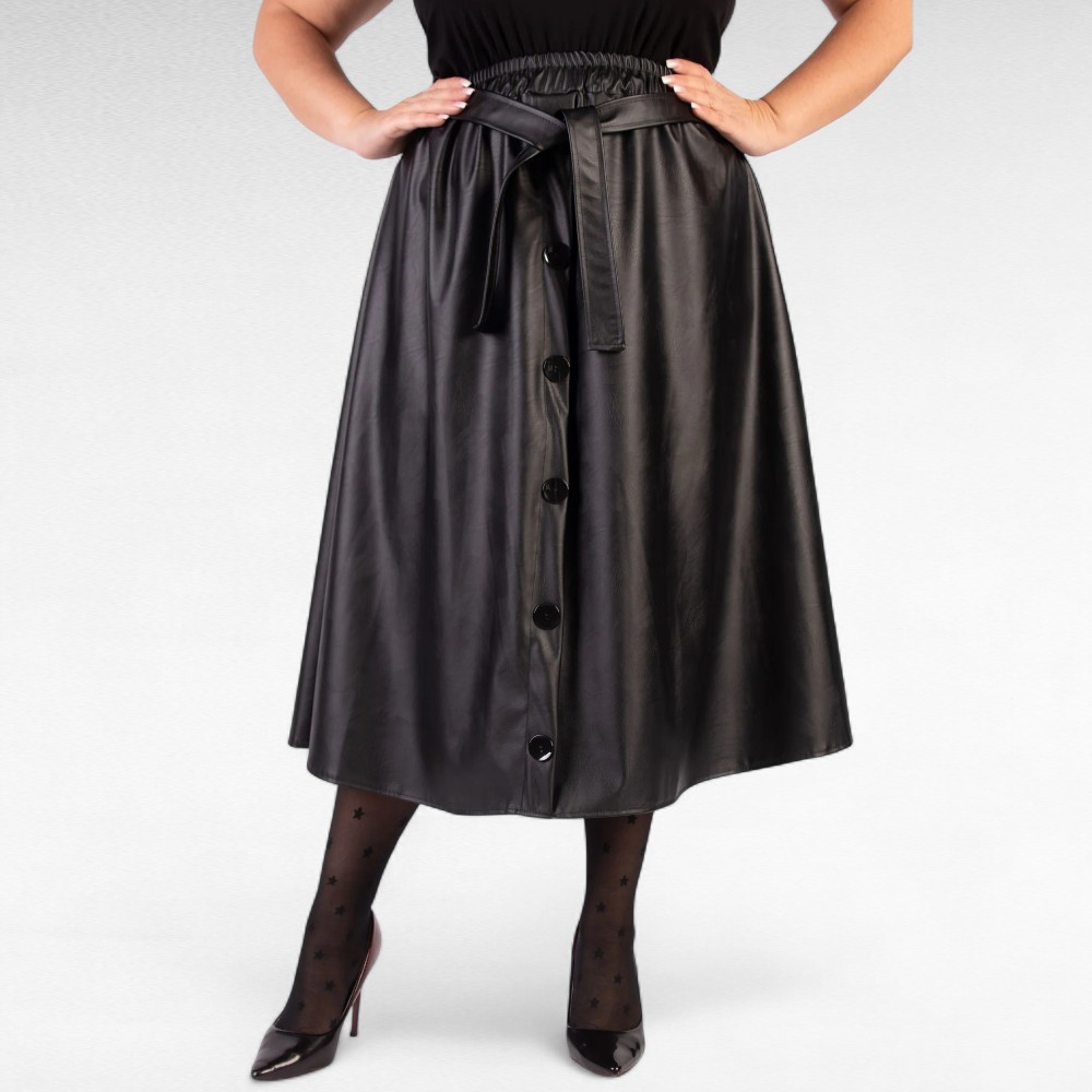 See must, alt kaunilt laieneva tegumoega seelik on valmistatud pehmest kunstnahast, mis langeb elegantselt ja loob igal kandjal pilkupüüdva silueti. Ees jookseb dekoratiivsete nööpidega detail, mis lisab juurde peenuse ja pidulikkuse noodi – just paras tasakaal lihtsuse ja luksuse vahel.