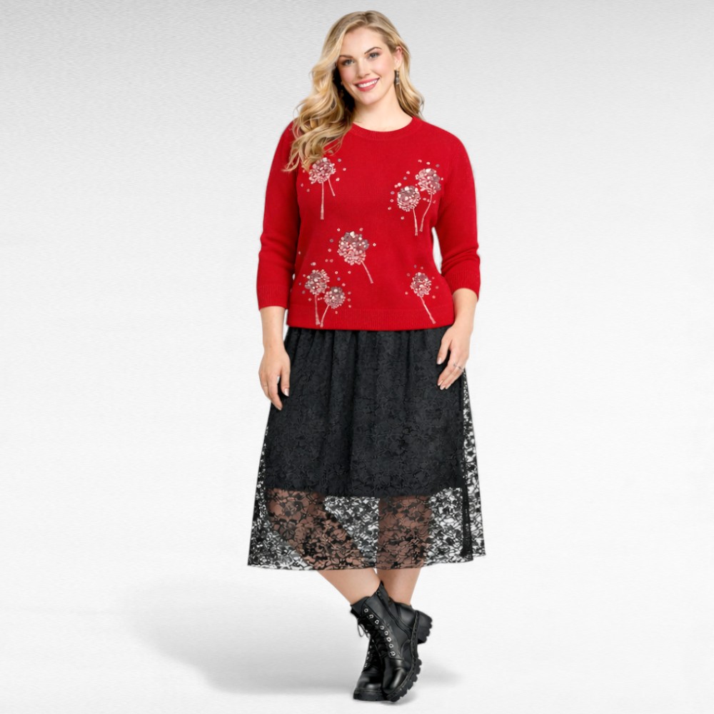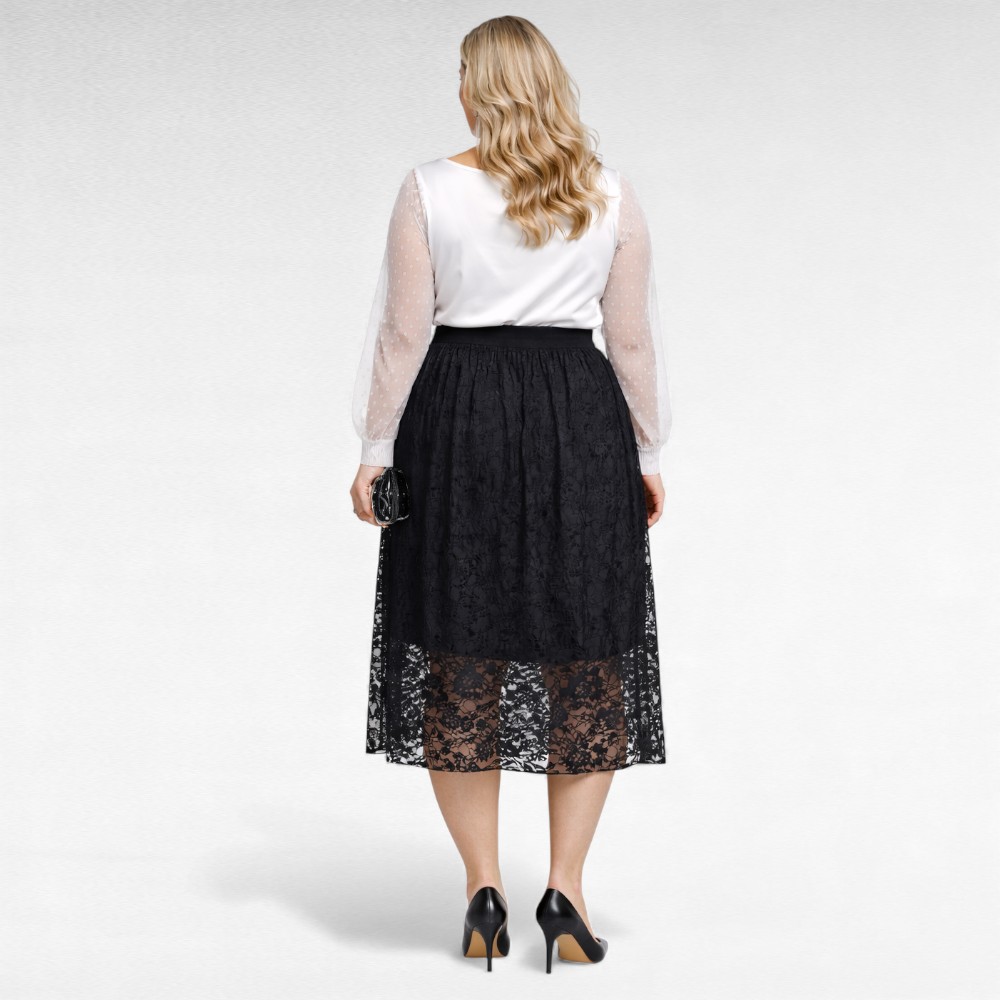 Must naiselik keskelt kummiga pitsseelik “Glairit” Inglismaalt. Vooder jääb veidi ülepoole põlvi ja seeliku pikkus on umbes poole sääreni. Kummiosa on väga veniv, sobib mitmele suurusele-valida tuleks siis vahemik, kuhu teie vöökoht jääb. Vöökohast on kroogitud ja puus on avar ning vabaltlangev.