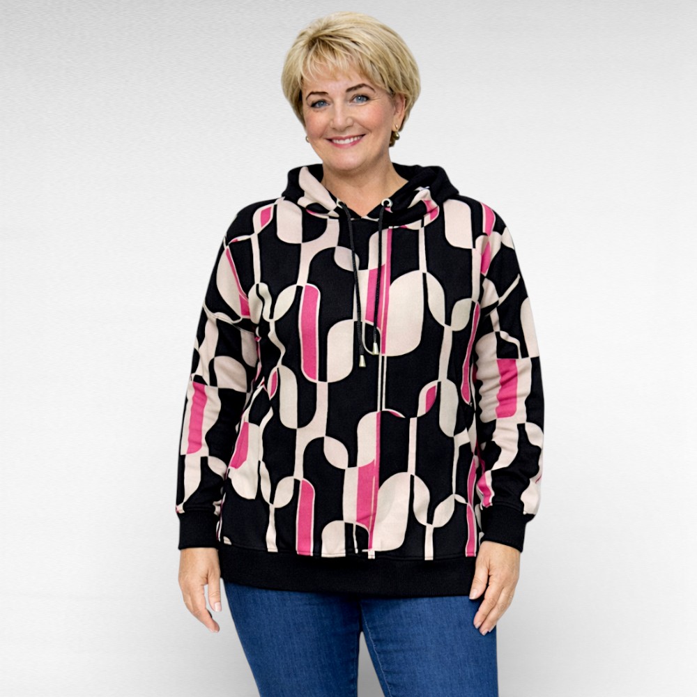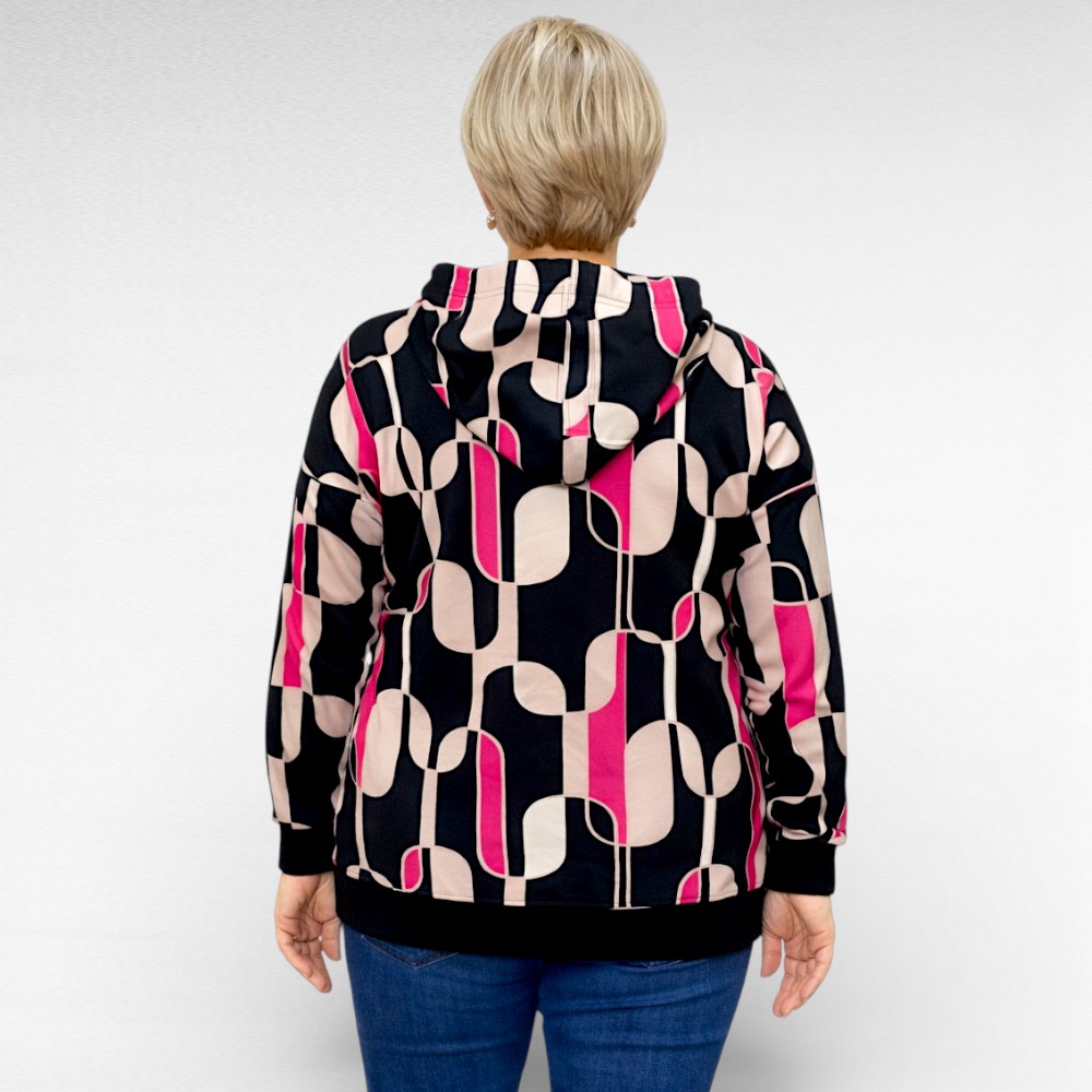 See kapuutsiga pusa „Wawa Collection“ on loodud naisele, kes hindab mugavust, isikupära ja stiili üheskoos. Pehme keskmise paksusega puuvillasegune materjal hoiab mõnusalt sooja, samas laseb nahal hingata – ideaalne nii kiireteks toimetusteks linnas kui ka aktiivseks päevaks liikumises. Pilkupüüdev roosa-, beeži- ja mustakirju geomeetriline muster lisab särtsu igale riietusele, samal ajal kui must soonikkude varrukaotstes ja allääres annab pusale kauni vormi ja hoiab istuvuse paigas. Pikad, õlast veidi pikendatud varrukad loovad modernse ja naiseliku joone ning pakuvad lisamugavust. See on pusa, mille tõmbad selga hea tundega ja tunned end enesekindlalt terve päeva.