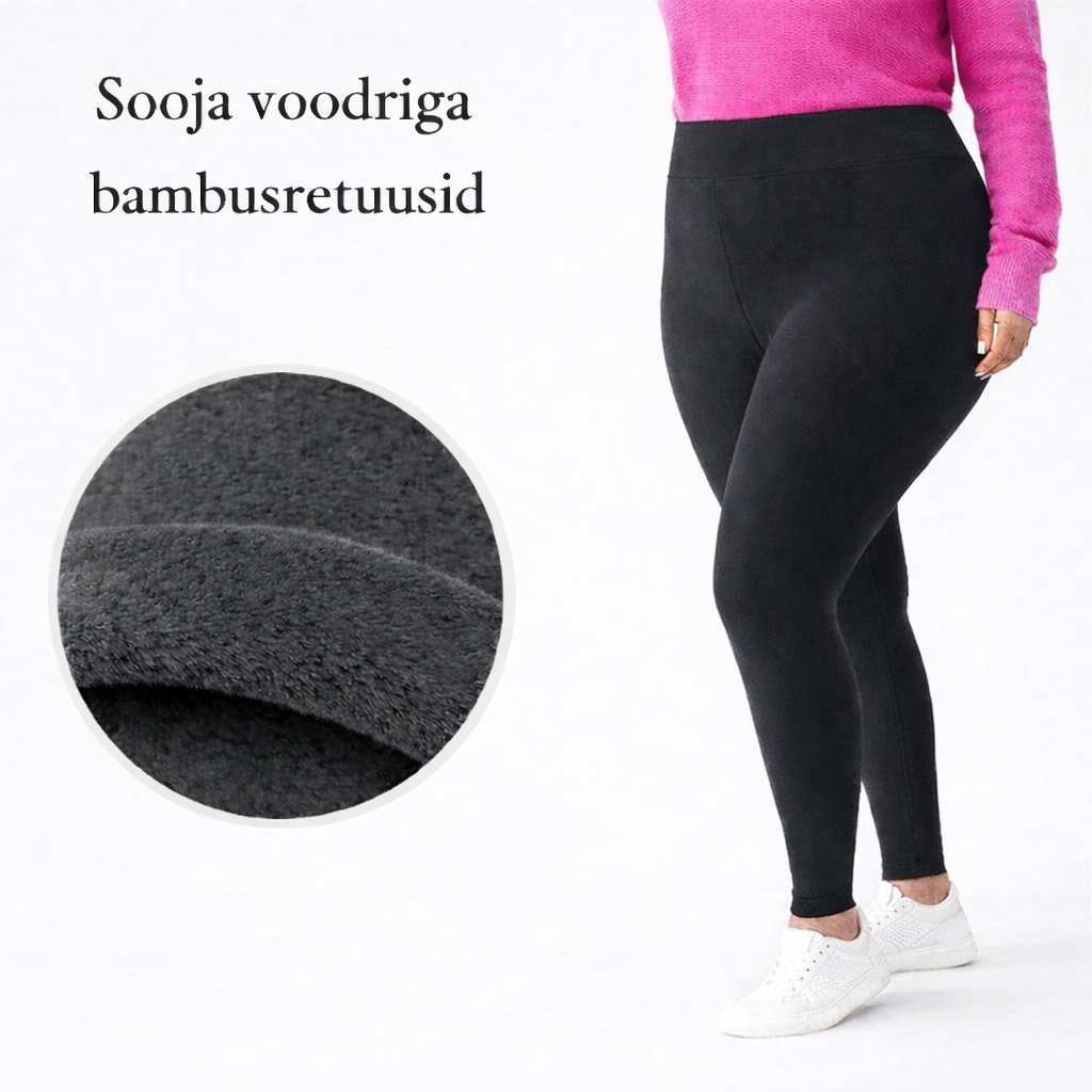 Uus toode! Supermõnusast hästi pehmest ja nahasõbralikust venivast materjalist ülevalt laia värvliga mustad pikad seest fliisvoodriga bambusretuusid “Termo bambus”. Täispikkus jääb kuni 165cm pikkuseni. Materjal on vastu nahka ülimõnus ja pehme, välja ei veni, topiliseks ei lähe. Parimad püksid jahedal ajal. Voodriks on pehme fliisvooder-sobivad hästi külmavarestele, kellel kodus külm on ja on parimad retuusid, mida saab talvel teiste pükste alla panna aluskihiks. Kui need juba all on ja teise püksid veel peal, siis ei saa külm enam küll kuskilt ligi.