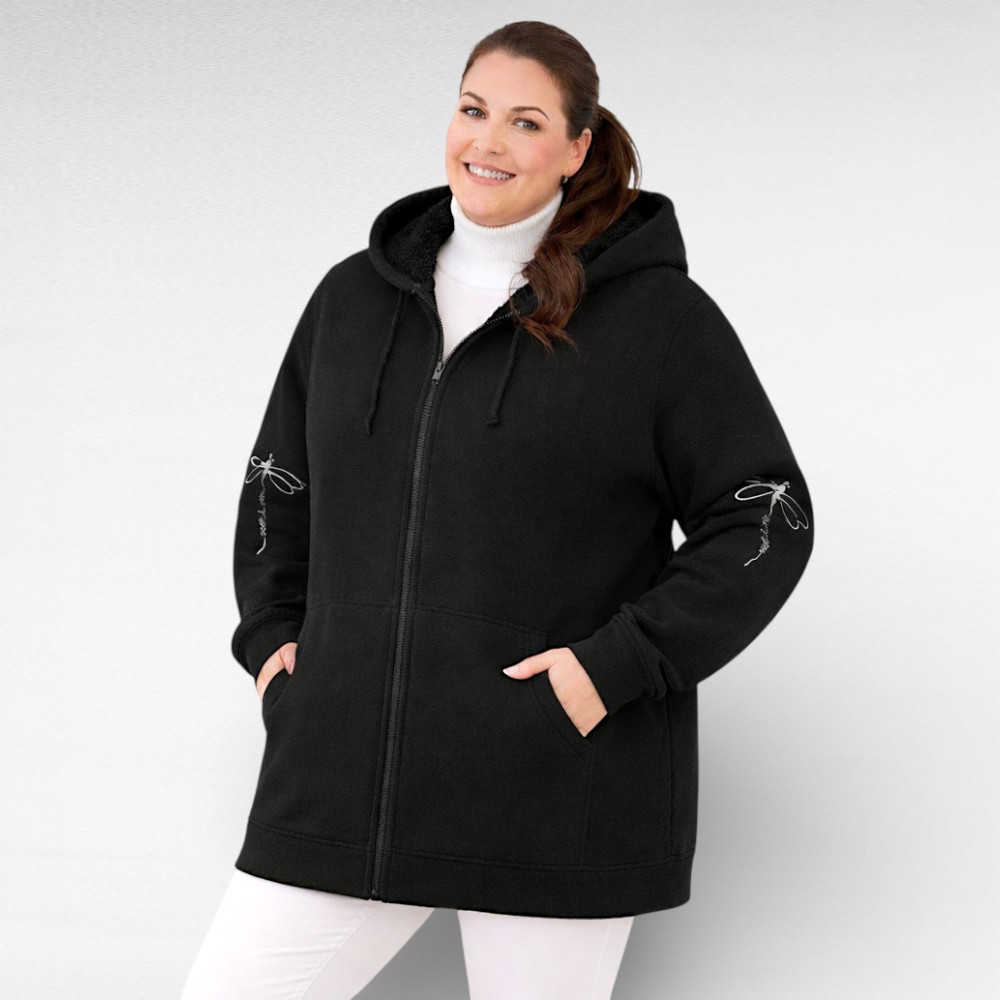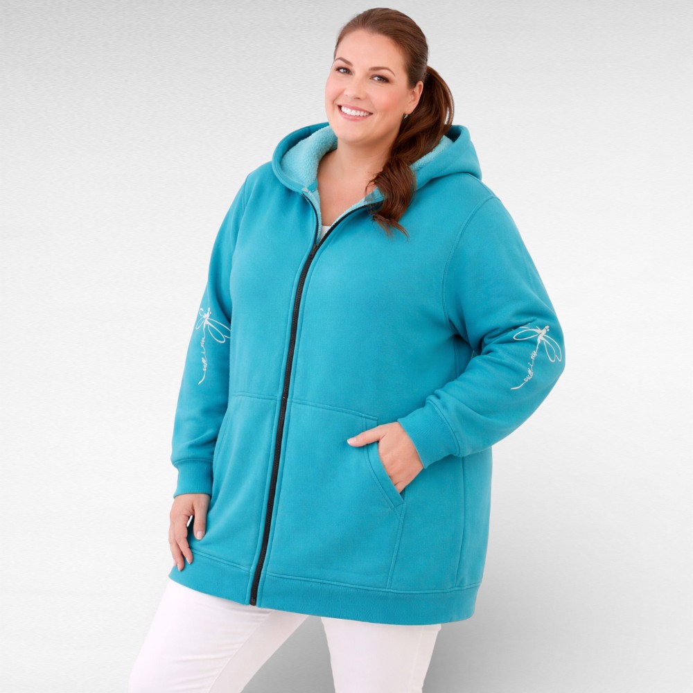 Seest fliisvoodriga soe eest lukuga kapuutsiga selja tagant ja varrukate pealt valgekirju ägeda kiilimustriga pluss suuruses dressipluus/jakk firmalt “Seraj”. Ees 2 taskut ning kapuutsi ääres on paelad, saab vajadusel kokku tõmmata. Varrukad on avarad, õlast pikendatud. Allääres ja varruka otstes on soonik. Sobib kanda aastaringselt. Talvel külmaga on eriti mõnus, saab sinna sisse peitu pugeda külma eest.