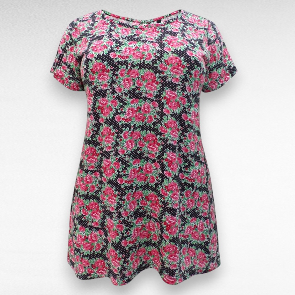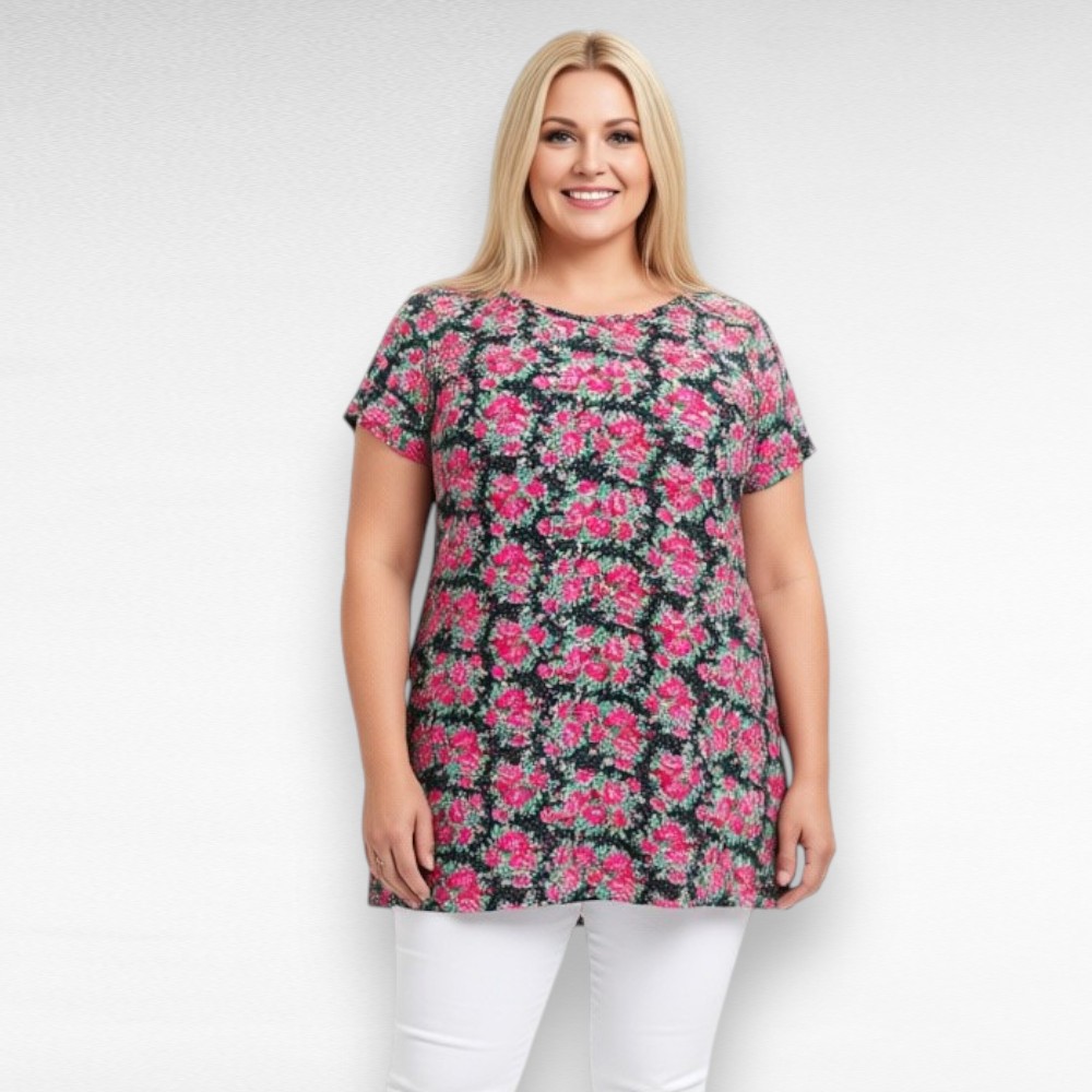 See Inglismaa firma “Ivans” lühikeste varrukatega pluss suuruses naiste tuunika on justkui suvine unistus – õrnalt A-lõikeline, alt veidi laienev lõige loob vaba ja naiseliku silueti, mis sobib igale kehakujule. Elurõõmsad punased lilled mustal taustal loovad särava, ent šiki kontrasti, mis ei jää märkamatuks.