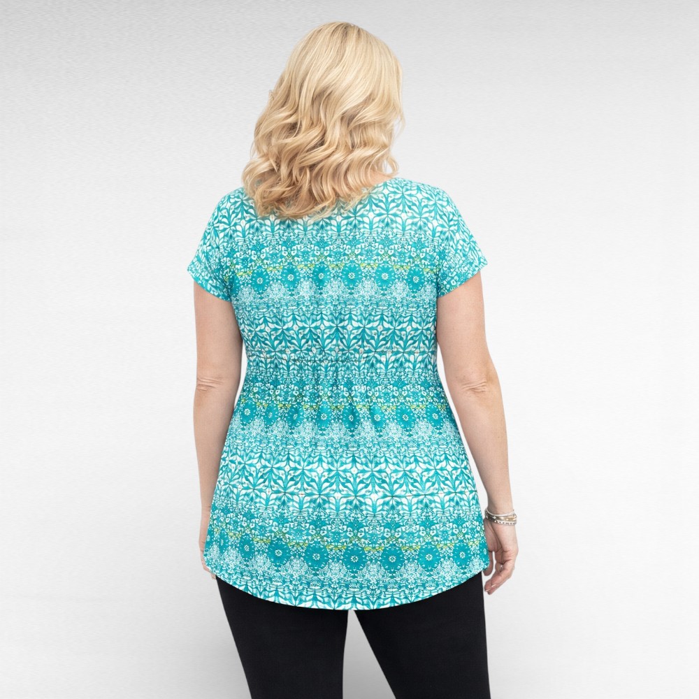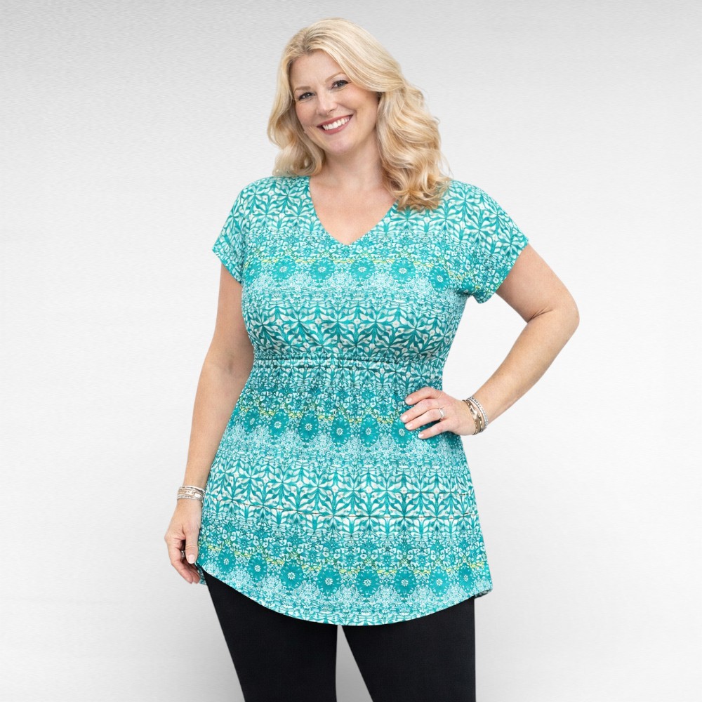 Nahasõbralikust pehmest hingavast stretchikast materjalist naiseliku V-kaelusega rohelise- ja valgekirju  lühikeste varrukatega tuunika “Pirjo” firmalt “Seppälä”. Altäär on veidi kaarjas. Vöökohas ees ja taga kergelt pingutav kumm, hoiab kenasti kehasse.