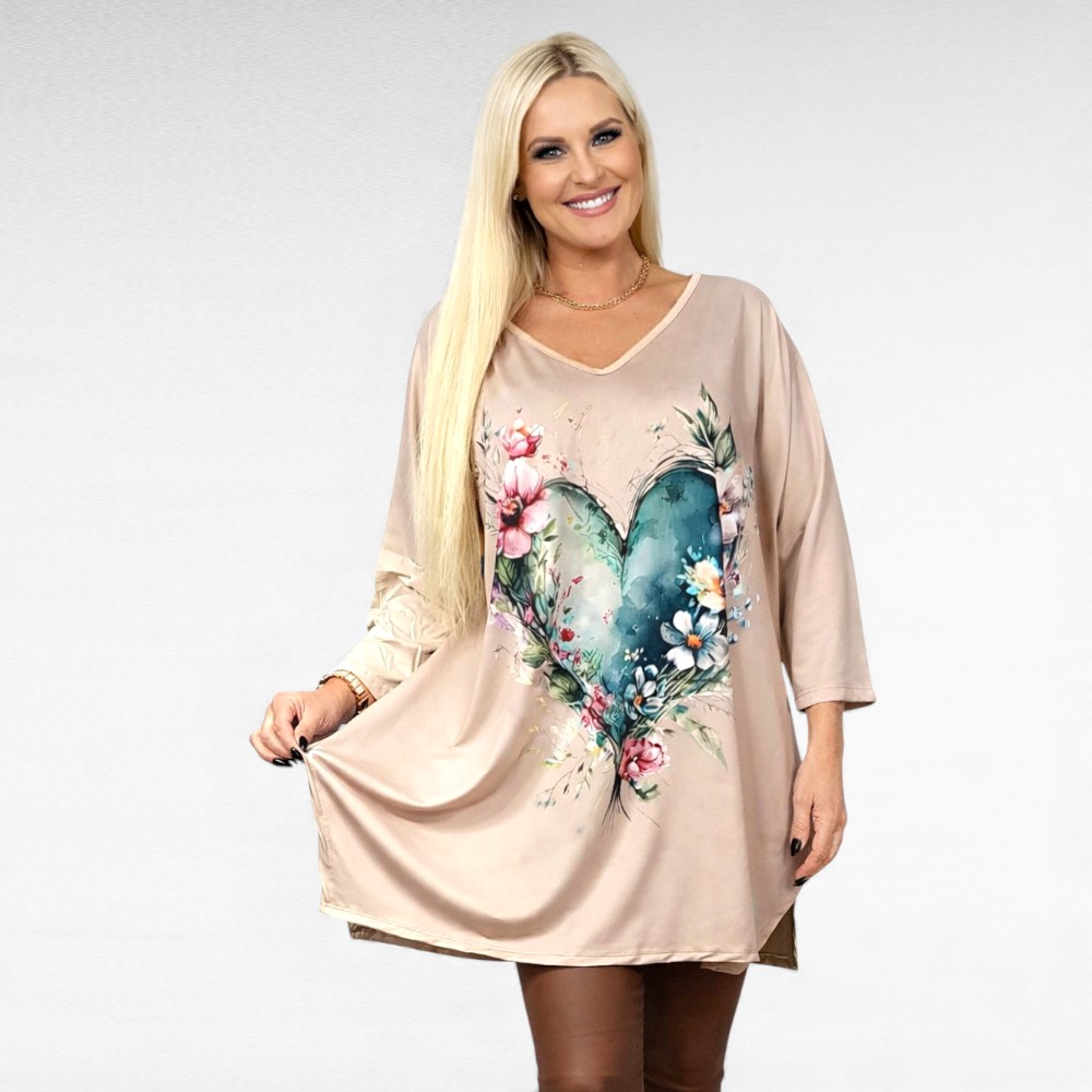 Mugav pehmest venivast materjalist V-kaelusega sirge lõikega beež kauni suure värvilise südame-ja lillemustriga poolpikkade kimonovarrukatega pluss suuruses  tuunika “Esmira Fashion”. Külgedel väikesed lõhikud. Selja tagant on ühevärviline.
